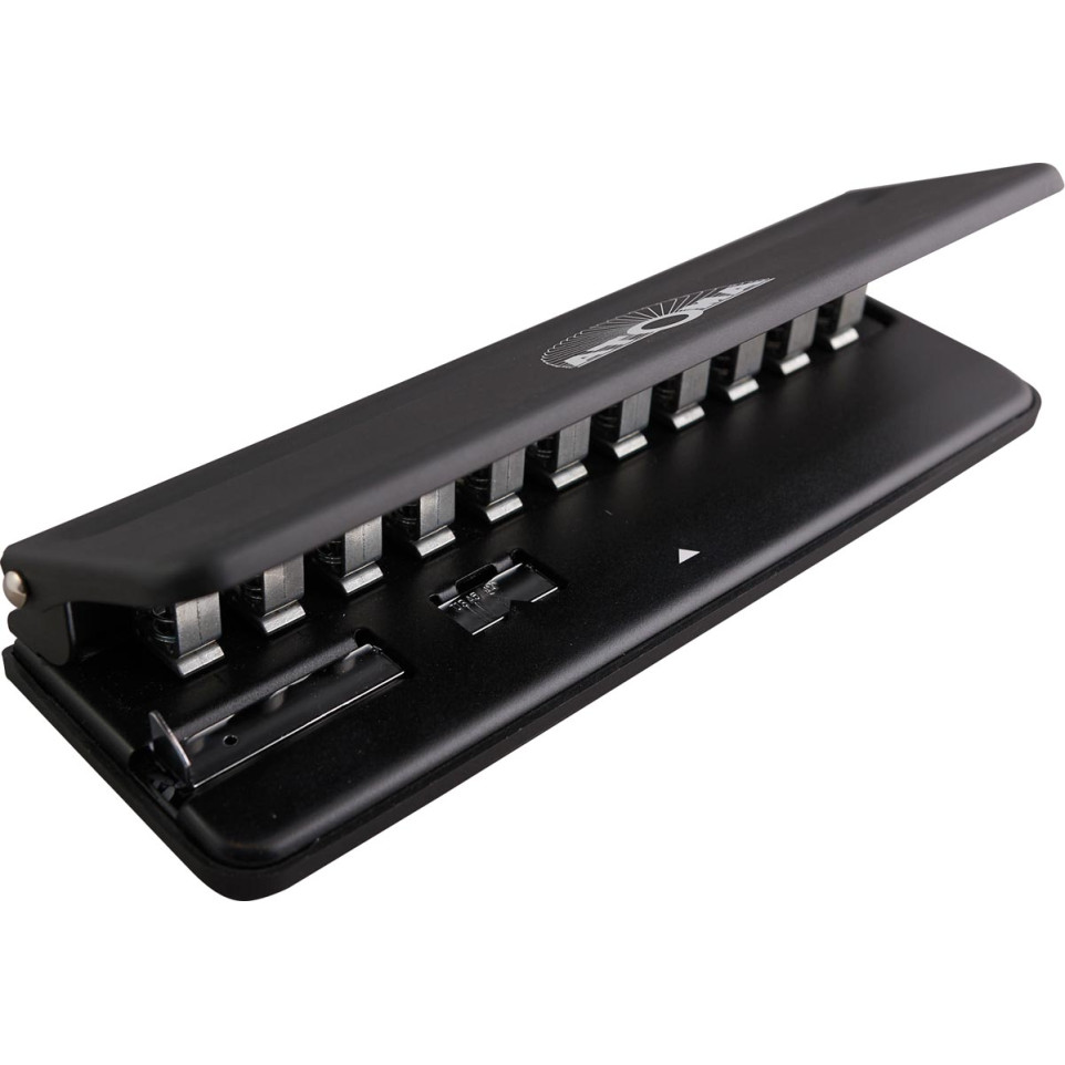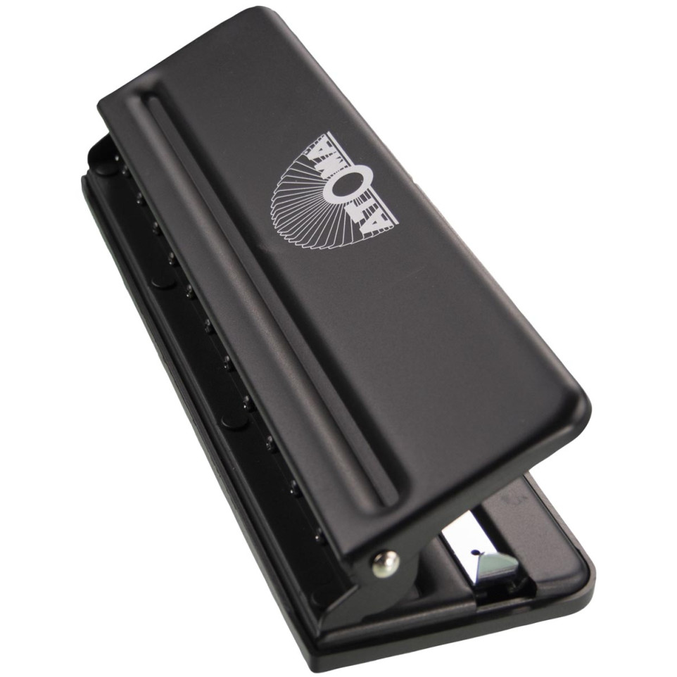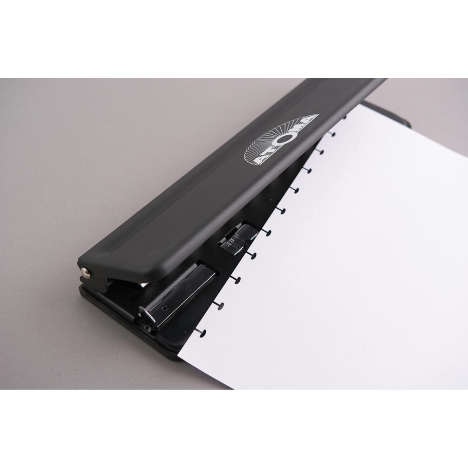 Perforateur multi trous noir Atoma, conçu pour ajouter ou archiver facilement des feuilles dans les cahiers et pochettes Atoma. Compatible avec les formats A6, A5 et A4, il crée jusqu’à 11 trous en un seul geste pour une organisation optimale.