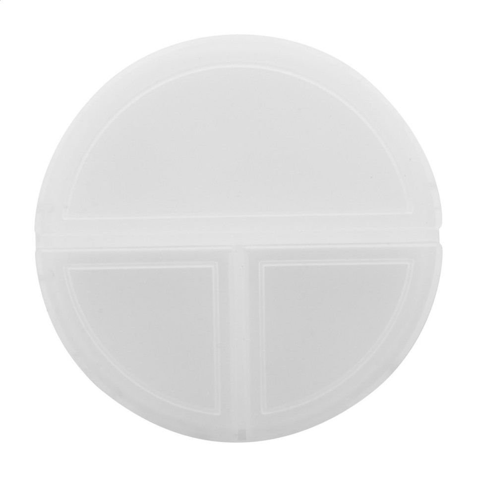 Pilulier transparent en PP recyclé à 3 compartiments, conçu pour organiser facilement la prise quotidienne de médicaments ou compléments. Idéal pour la gestion des traitements en déplacement, au bureau ou à domicile.
