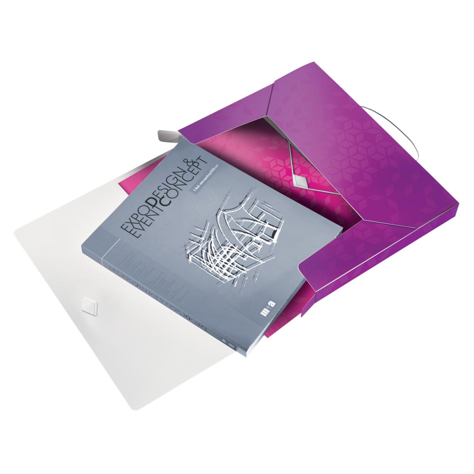 Boîte de classement Leitz WOW au format A4 (25 x 33 cm), conçue pour organiser, transporter et protéger jusqu’à 250 feuilles ou autres chemises. Idéale pour une utilisation au bureau ou en déplacement, avec une teinte violette moderne.