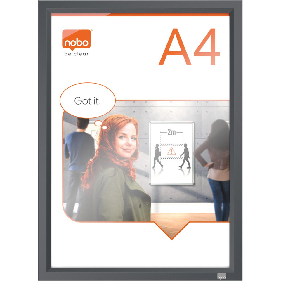 Porte-affiche Nobo Impression Pro au format A4 doté d’un cadre gris, idéal pour présenter vos informations dans des environnements professionnels, bureaux ou espaces publics. Conçu pour une installation murale discrète, il facilite la mise en avant de documents.