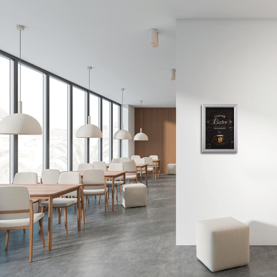 Cadre à clapets Europel Economy, format A4, conçu pour afficher et protéger efficacement vos documents, informations ou promotions dans les espaces professionnels ou publics. Finition argentée moderne adaptée à tous les environnements.