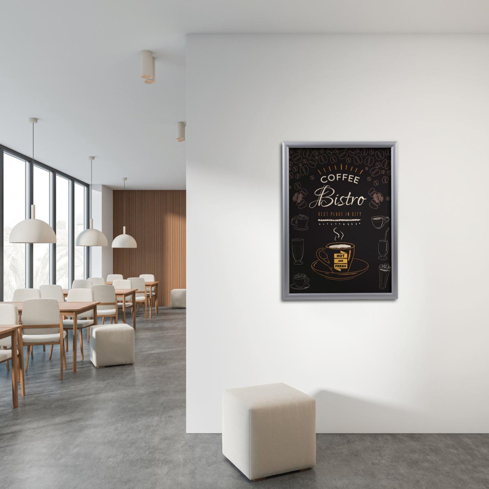 Cadre à clapets Europel Economy en format A2, conçu pour l’affichage de documents, d’informations ou de promotions dans les bureaux, commerces et lieux publics. Coloris argent, profil de 25 mm, usage intérieur ou protégé.
