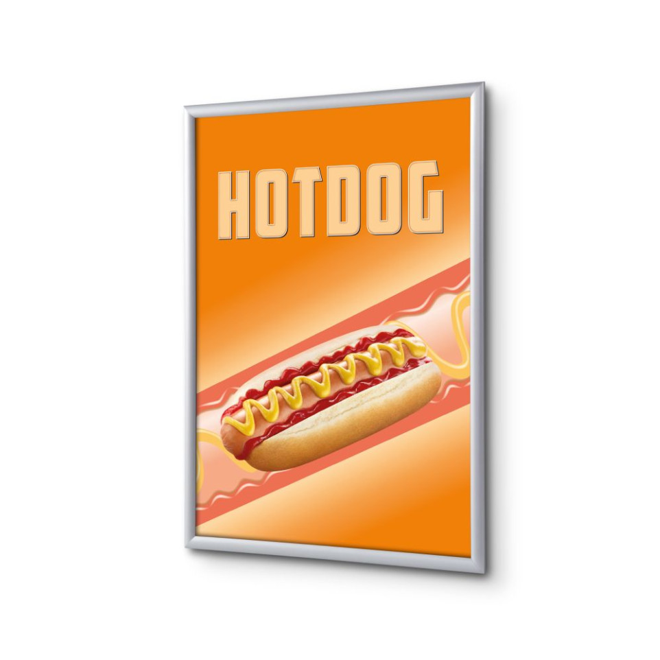 Cadre Clic-clac A4 Komplett-Set Hot-dog Anglais, adapté à l'affichage mural de documents ou d'affiches au format A4 dans des environnements professionnels, commerciaux ou publics.