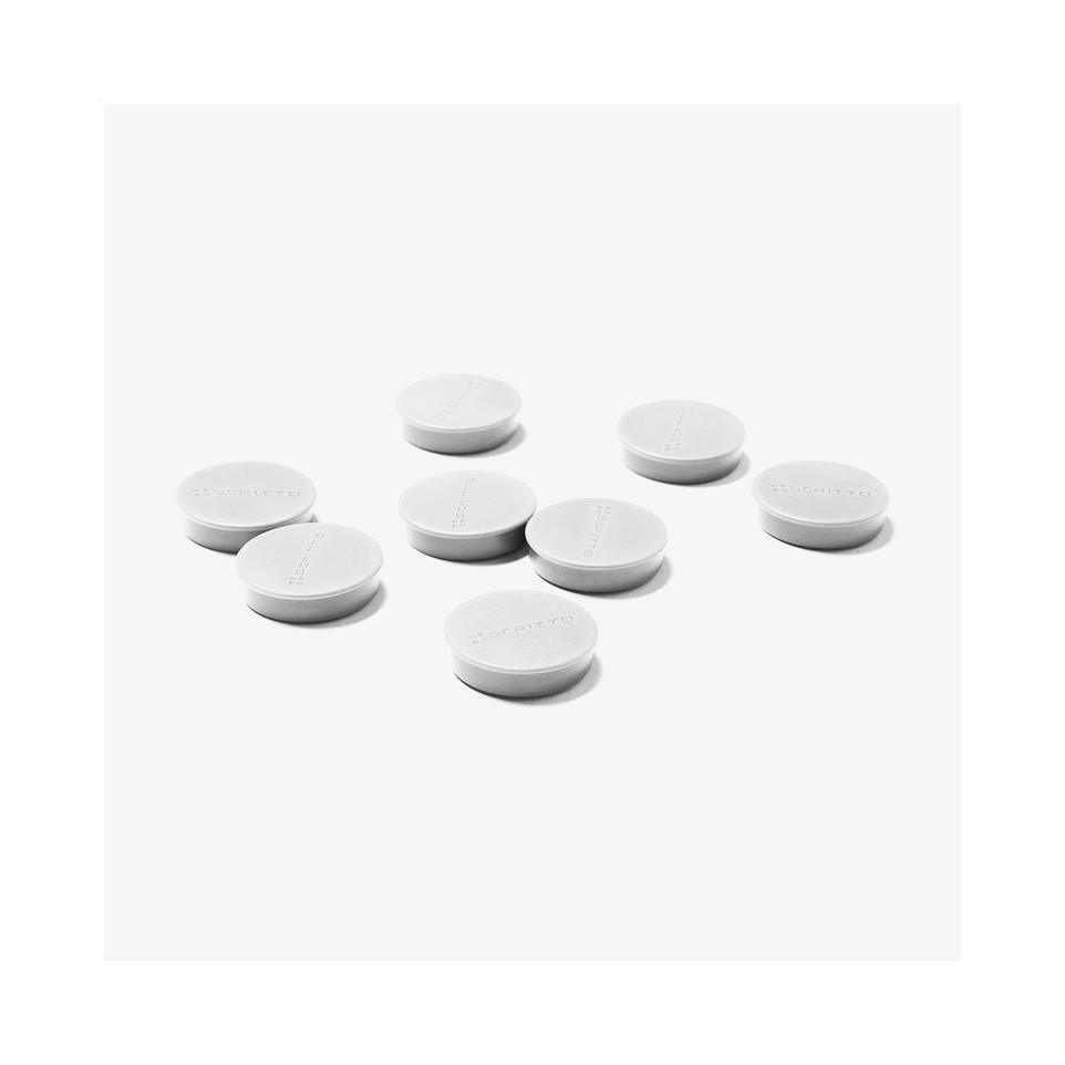 Set de 10 aimants ronds blancs Scritto® de 3,5 cm de diamètre, conçus pour la fixation de documents, notes ou supports sur tous types de tableaux blancs magnétiques, dans les environnements de travail collaboratif ou d'affichage.