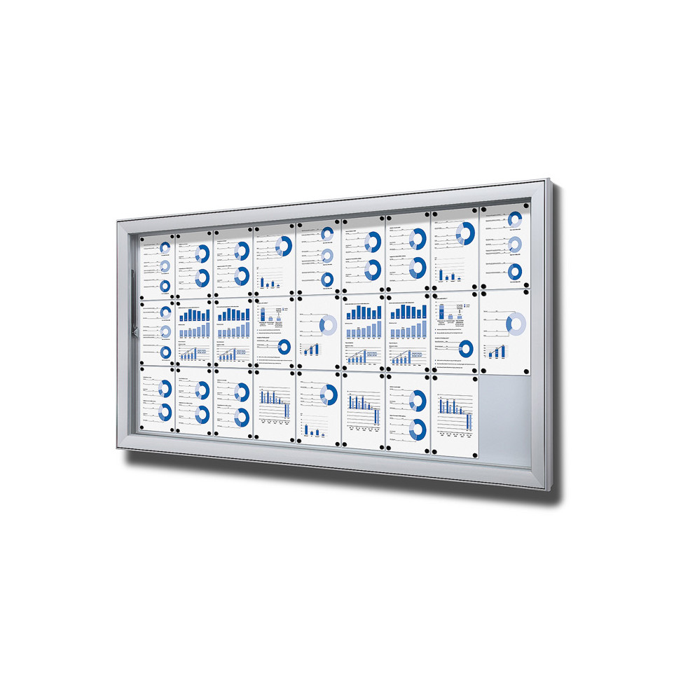 - Structure en aluminium anodisé robuste avec panneaux d’affichage en acier laqué magnétique blanc. Portes en verre trempé sécurisées par serrure à clé, profondeur intérieure pour afficher des documents épais ou superposer.