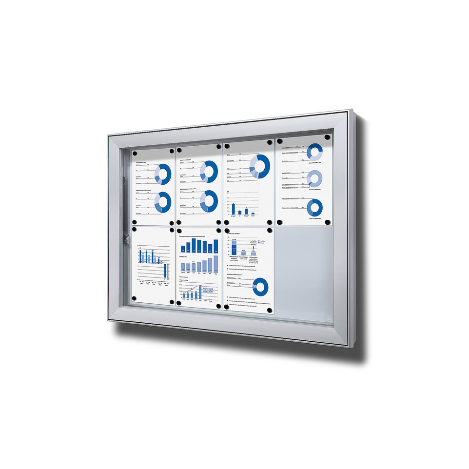 Vitrine extérieure verrouillable extra profonde prévue pour accueillir 8 affiches format A4. Idéale pour afficher des documents, annonces ou informations dans les lieux publics ou privés nécessitant sécurité et visibilité prolongée.