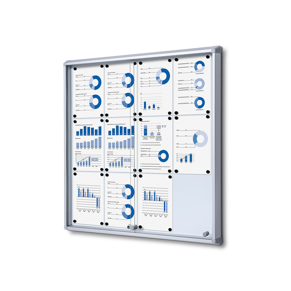 Vitrine intérieure verrouillable avec portes coulissantes, conçue pour afficher jusqu’à 12 documents au format A4 en environnement intérieur. Idéale pour bureaux, espaces publics, écoles ou collectivités.