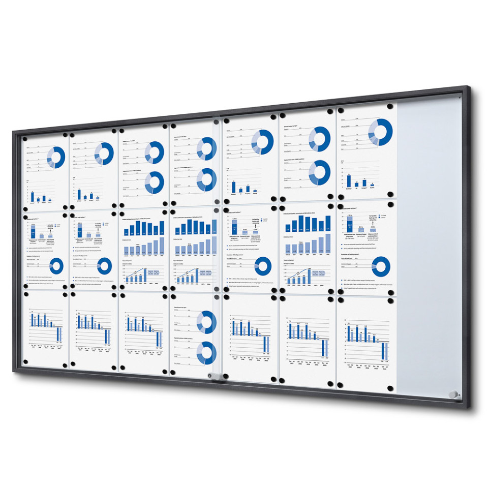 Vitrine intérieure verrouillable à portes coulissantes, format slim, conçue pour exposer jusqu’à 24 documents A4. Idéale pour les espaces professionnels, établissements scolaires et lieux publics souhaitant présenter des affiches en toute sécurité.