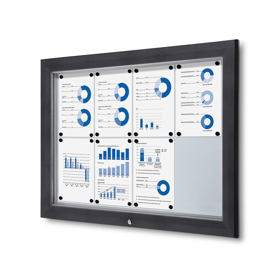 Vitrine extérieure verrouillable au format 8x A4, finition anthracite, conçue pour l’exposition de documents, annonces ou affiches en lieux publics, collectivités, entreprises ou écoles. Usage optimal en extérieur grâce à sa conception robuste et sécurisée.