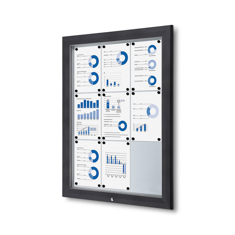 Vitrine extérieure verrouillable conçue pour afficher 9 feuilles A4, idéale pour la présentation d’informations ou d’annonces dans les espaces publics ou privés. Convient parfaitement à un usage professionnel en extérieur grâce à sa robustesse et sa sécurité renforcée.