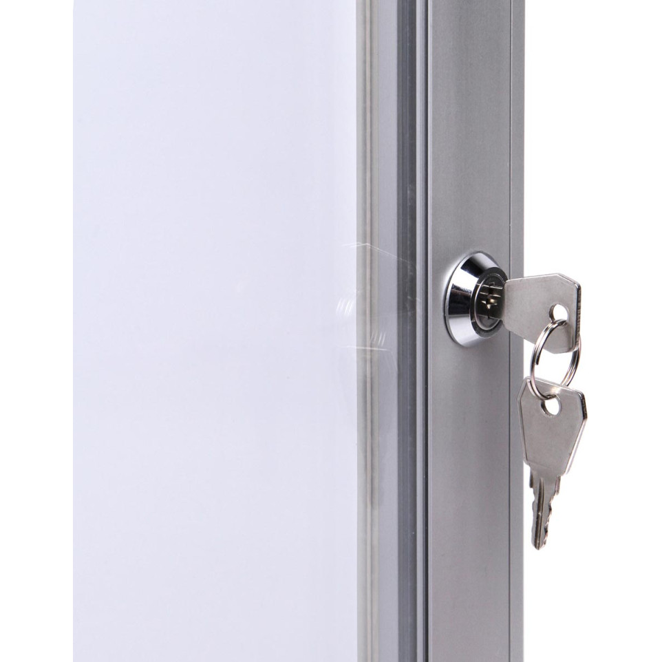 Fixez la vitrine au mur à l’aide du kit fourni. Affichez jusqu’à quatre documents A4 à l’intérieur grâce au fond magnétique, utilisable avec des aimants ou des marqueurs effaçables. Ouvrez la vitrine pour changer les affiches ; l’accès reste sécurisé tout en protégeant les informations contre les intempéries et les manipulations non autorisées.