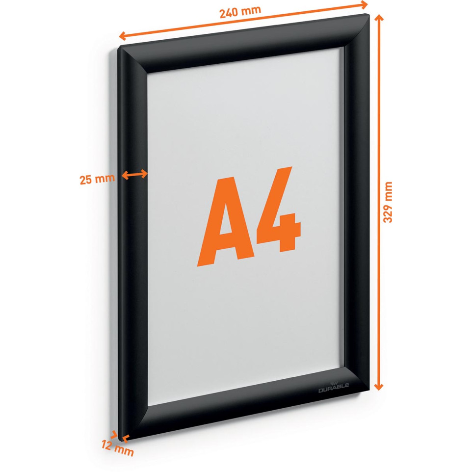 Cadre porte affiche A4 de la marque Durable, conçu pour afficher clairement informations, menus ou annonces dans tout espace professionnel ou commercial. Sa structure noire élégante s’adapte discrètement à tout environnement.
