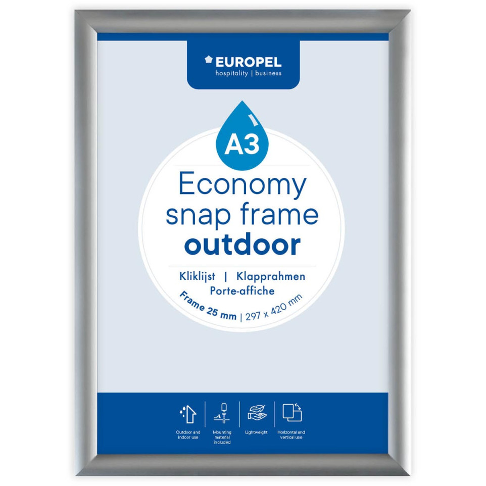 Le cadre à clapets Europel Economy, étanche, est conçu pour l'affichage à l'intérieur et à l'extérieur, format A3. Il protège efficacement les affiches contre la poussière et l'humidité.