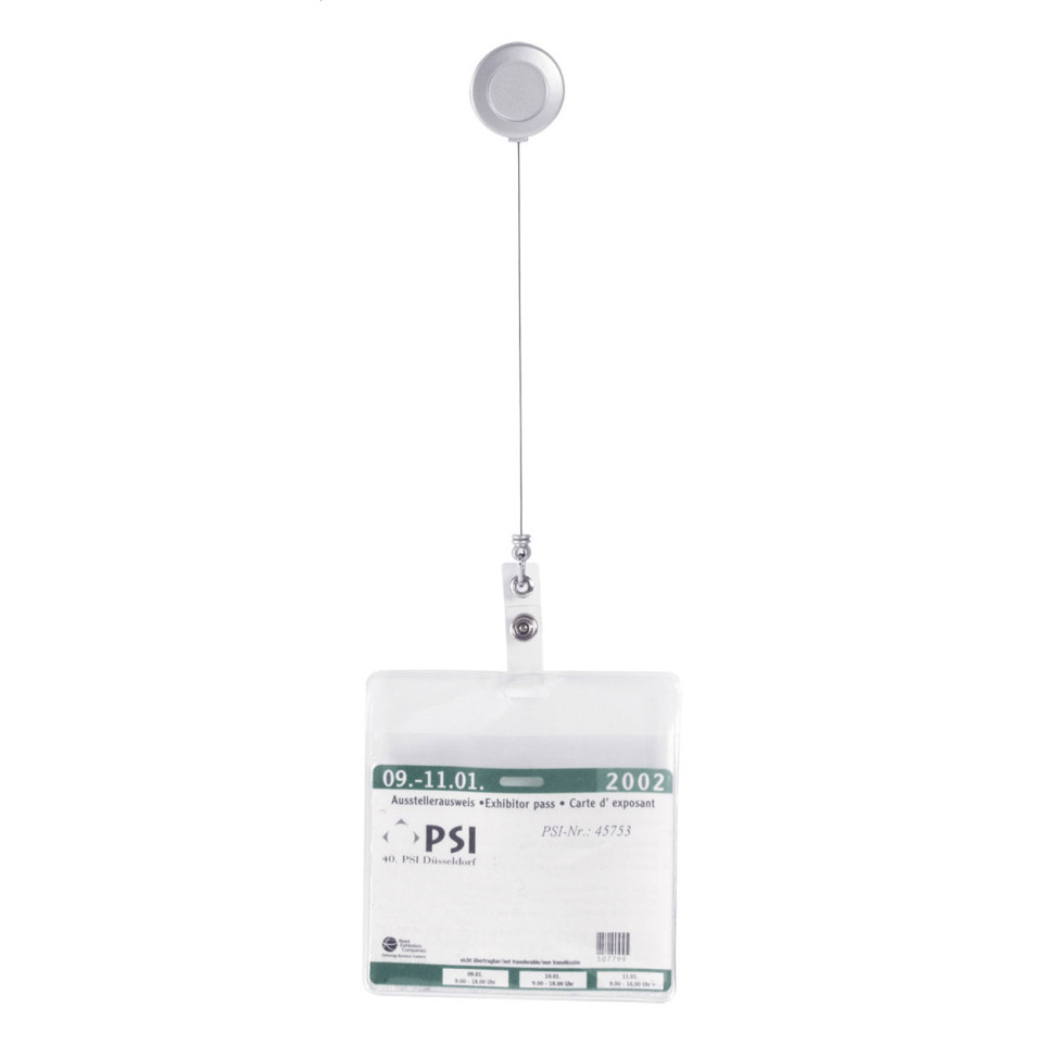 Porte-badges en plastique au design argenté, doté d’un bouton pression, d’une cordelette télescopique et d’un clip en métal pour une fixation rapide et sécurisée. Idéal pour l’identification lors d’événements, en entreprise ou dans les espaces sécurisés.