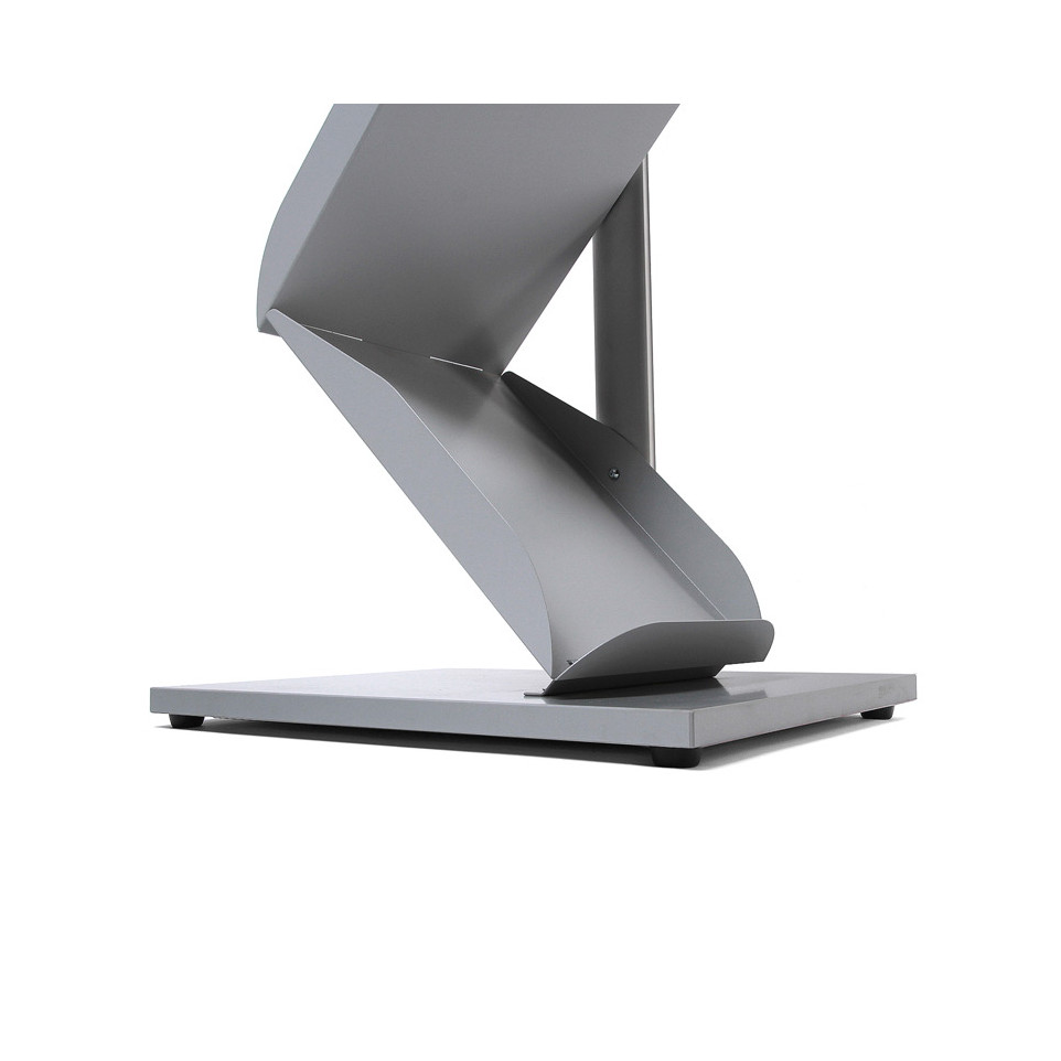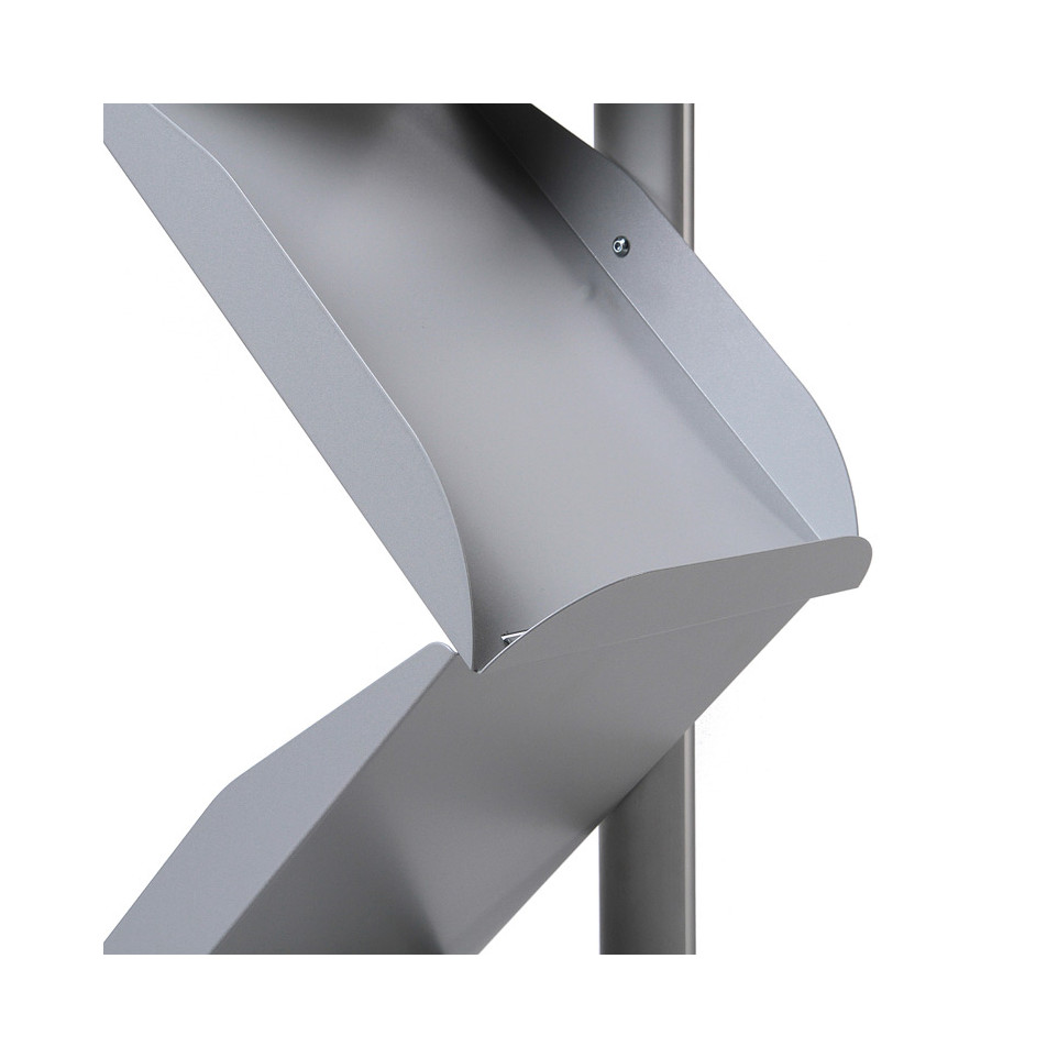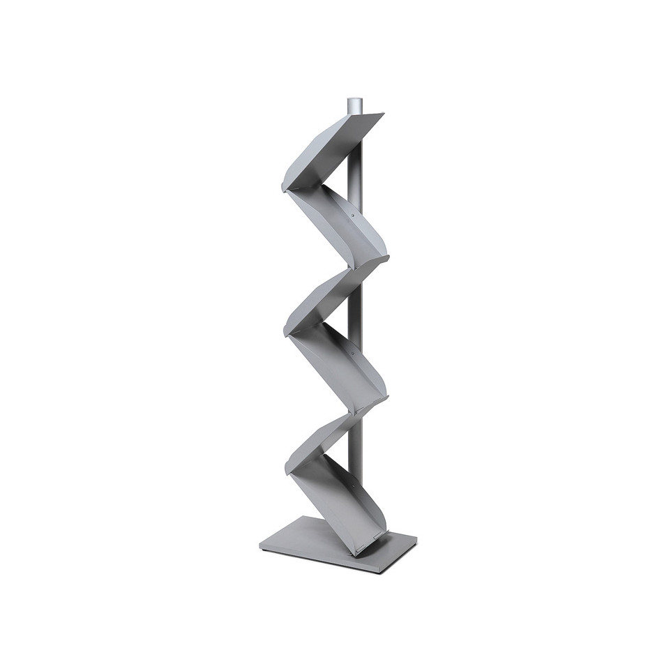Présentoir porte-brochures Zig Zag 6x A4 en aluminium argenté, conçu pour mettre en valeur des documents au format A4 sur 6 niveaux transparents. Idéal pour une présentation professionnelle lors de salons, en showroom ou en accueil d’entreprise.