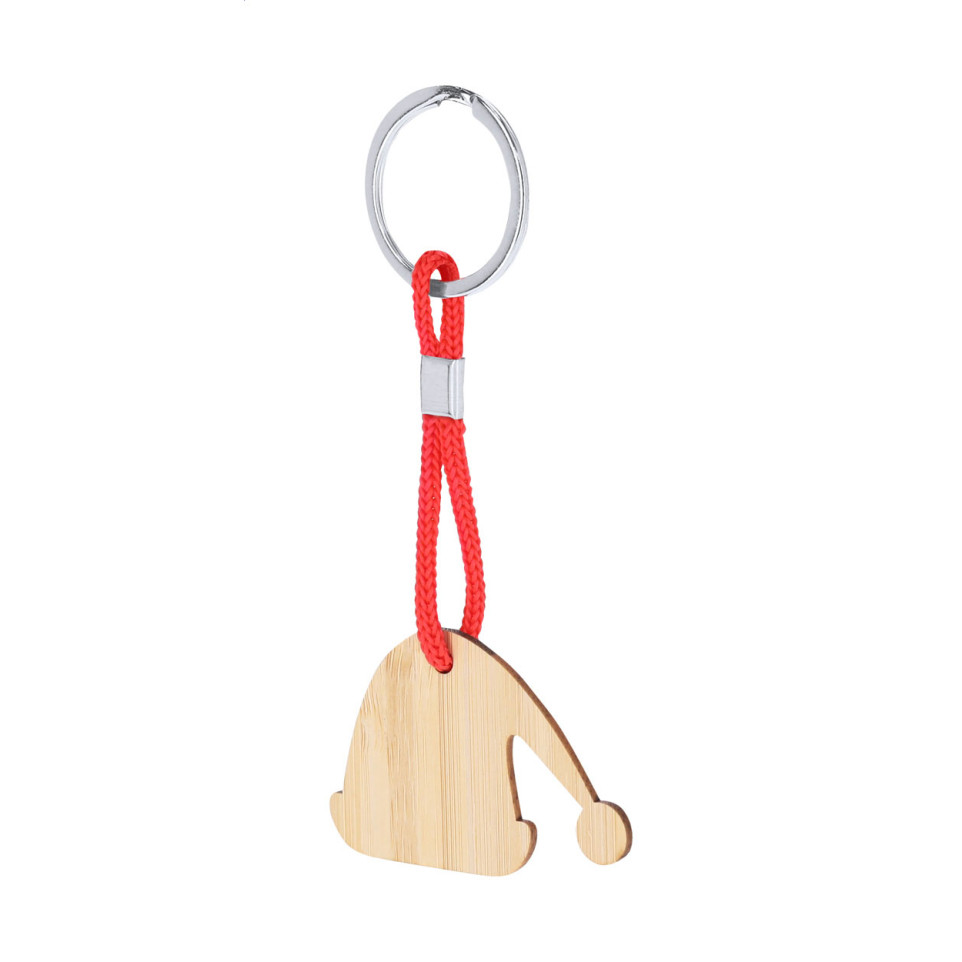 Porte-clés décoratif de Noël en contreplaqué de bambou, équipé d’un petit chapeau de Noël rouge, d’une ficelle rouge et d’un anneau en métal solide. Idéal comme accessoire saisonnier pour trousseaux ou cadeaux d’entreprise.