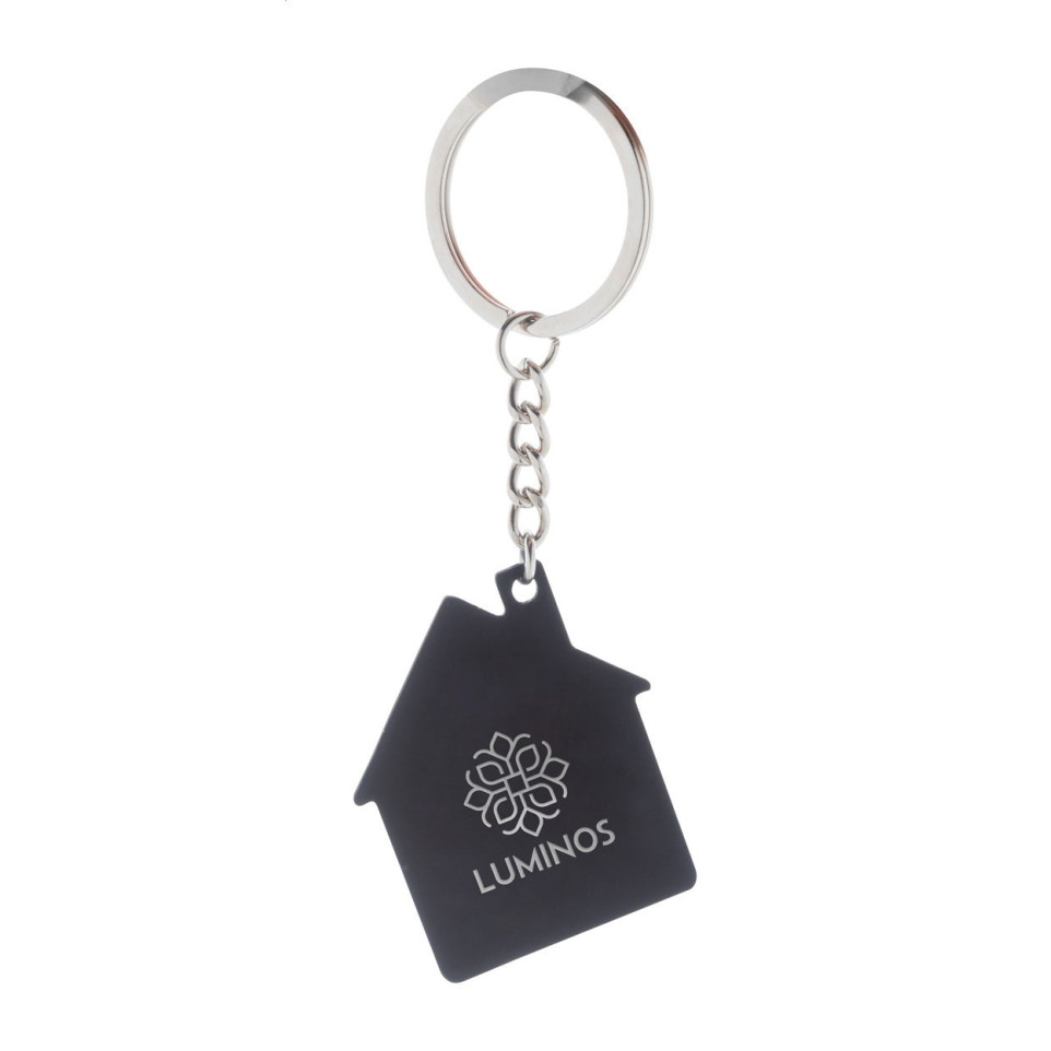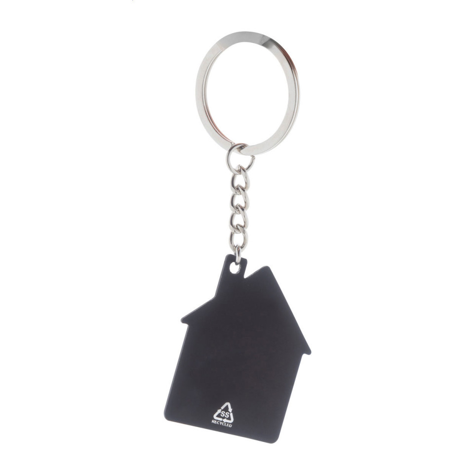 Porte-clés HutShine noir en acier inoxydable recyclé, prenant la forme d’une maison, idéal pour sécuriser et organiser vos clés au quotidien tout en affichant un style moderne et sobre.