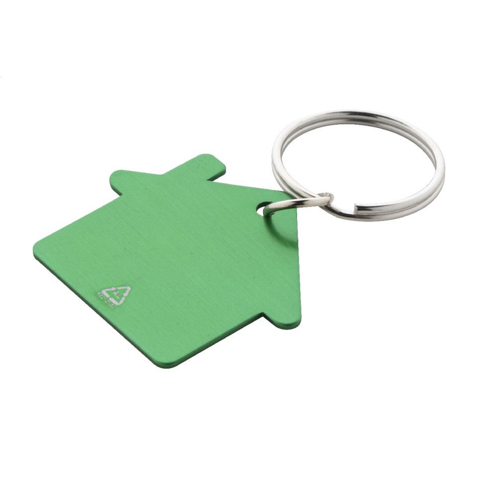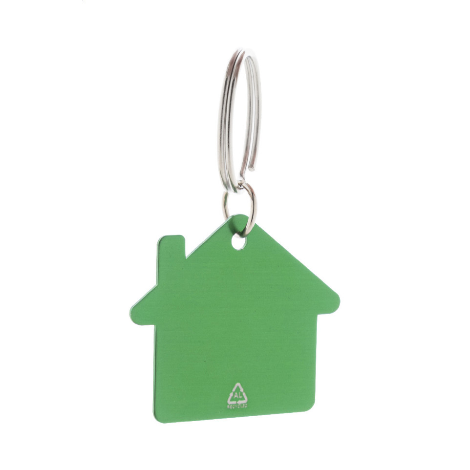 Porte-clés vert en aluminium recyclé, conçu en forme de maison, équipé d’un anneau robuste pour accrocher facilement clés, badges ou accessoires au quotidien.