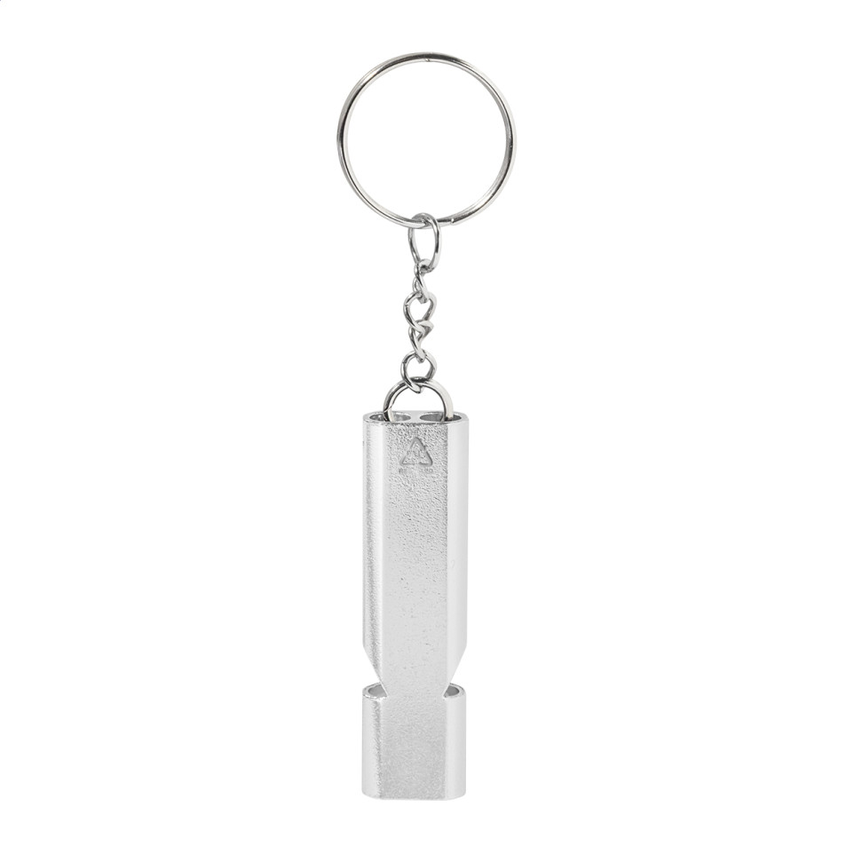 Porte-clés sifflet fabriqué en aluminium recyclé, alliant fonctionnalité et praticité. Idéal comme accessoire du quotidien, il se glisse facilement sur un trousseau de clés.