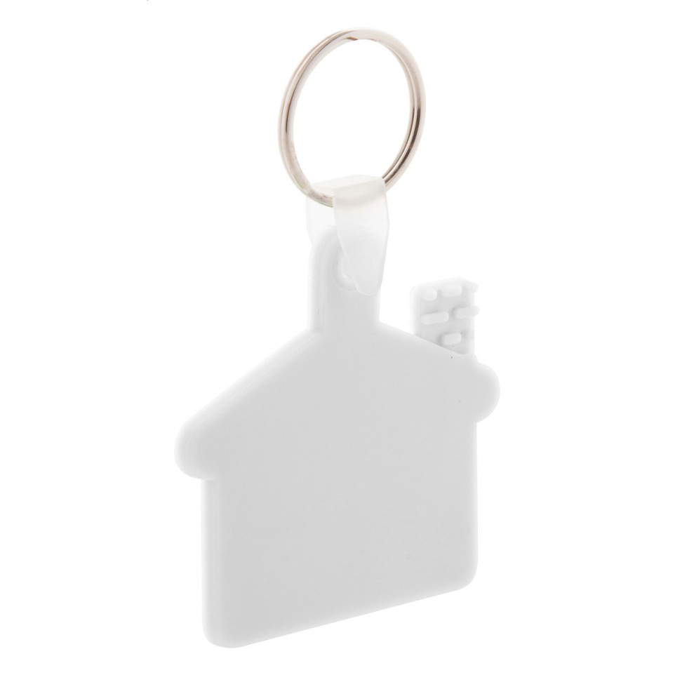 Porte-clés en plastique blanc en forme de maison doté d’un anneau en métal robuste, idéal comme accessoire fonctionnel pour regrouper vos clés de maison ou de bureau au quotidien.