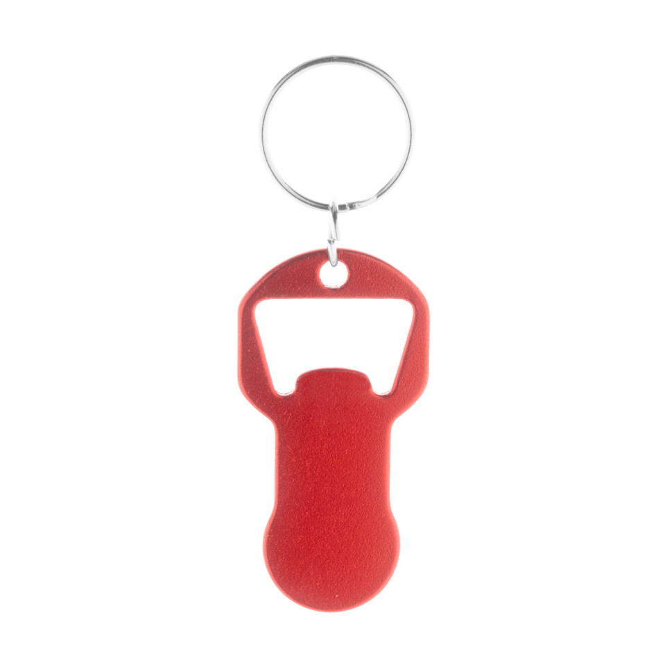 Porte-clés décapsuleur Biropi rouge en aluminium recyclé, doté d’un jeton de chariot intégré. Pratique au quotidien, il permet d’ouvrir facilement les bouteilles et d’accéder aux chariots de supermarché sans chercher de monnaie.