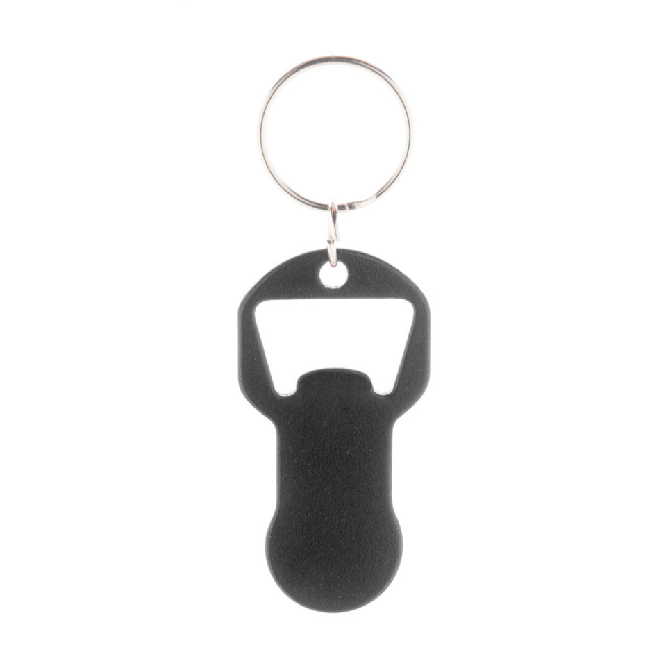 Porte-clés décapsuleur en aluminium recyclé avec jeton de chariot intégré. Accessoire multifonctionnel combinant praticité quotidienne et engagement écologique.