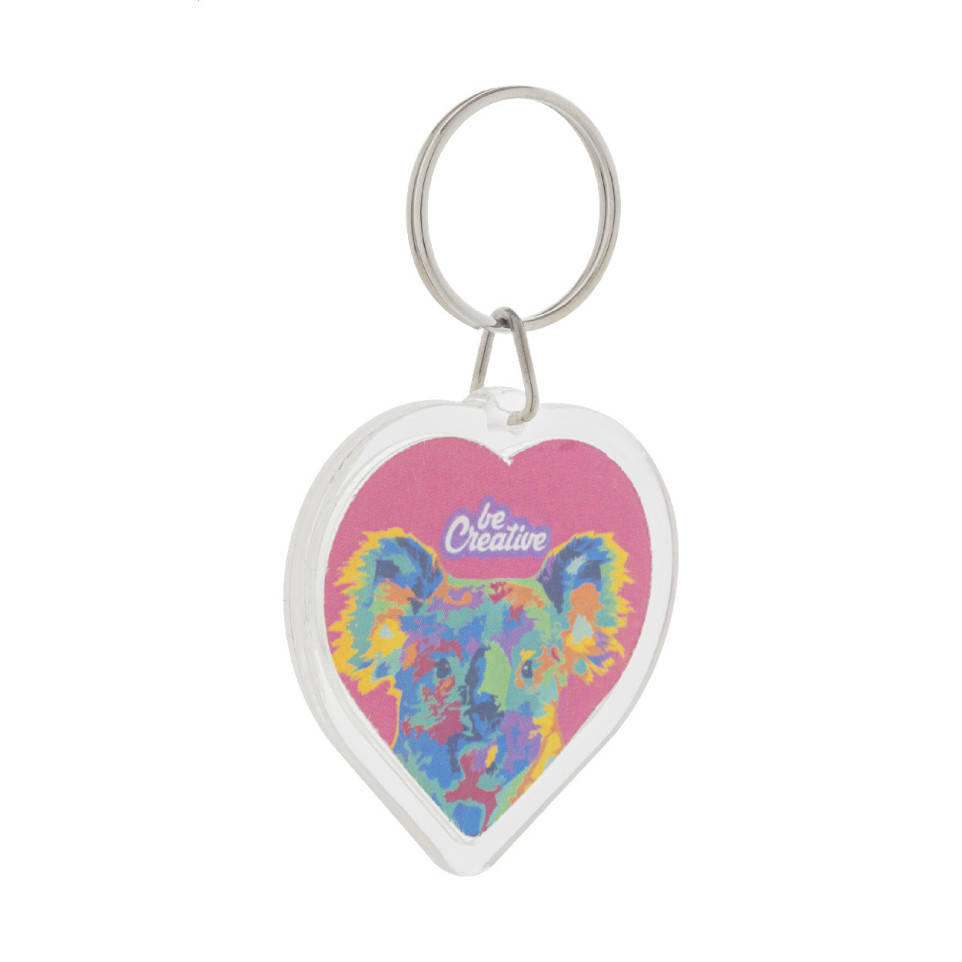 Porte-clés en acrylique transparent en forme de cœur, conçu pour accueillir une insertion de papier personnalisée quadri. Idéal pour accompagner vos clés au quotidien ou offrir lors d’événements d’entreprise.