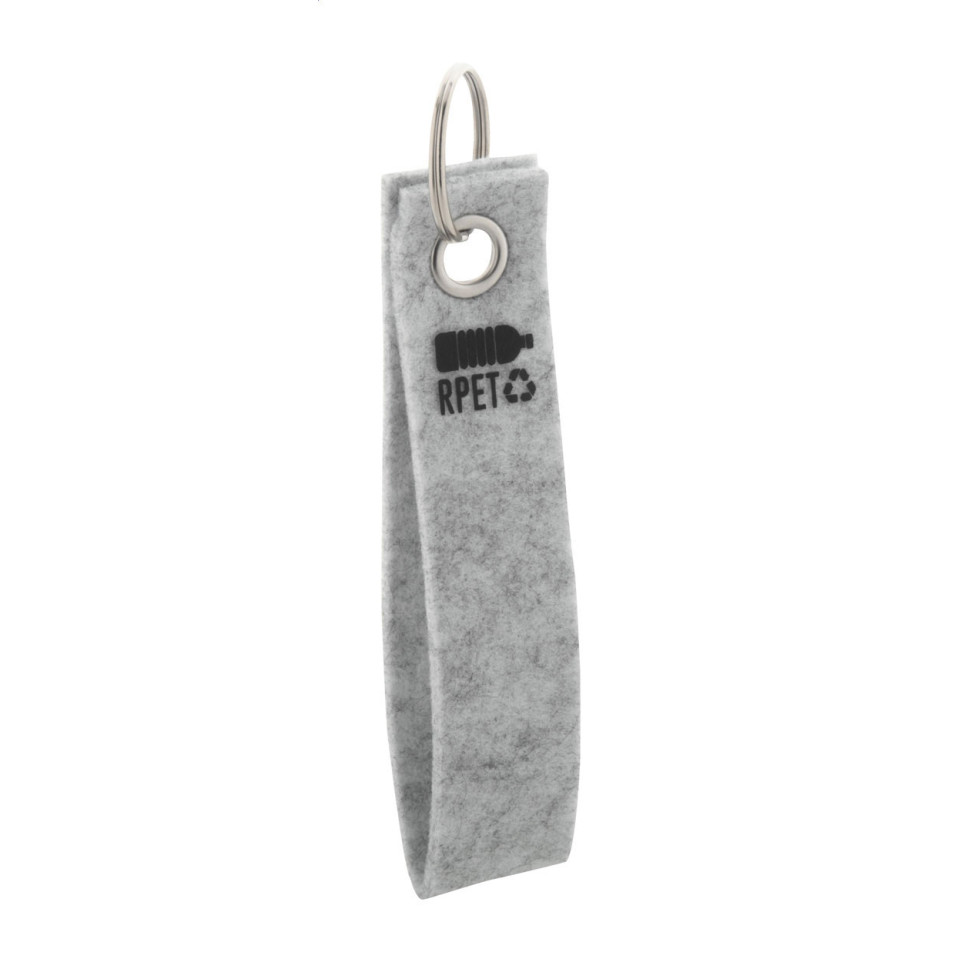Porte-clés en feutrine grise RPET équipé d’un anneau en métal, idéal pour sécuriser clés ou badges au quotidien. Convient parfaitement pour une utilisation en entreprise, événementielle ou personnelle.