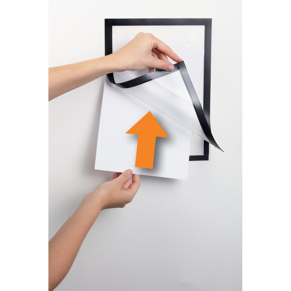 Le Durable Duraframe Wallpaper est un cadre autocollant noir, format A4, conçu pour afficher facilement des documents sur des surfaces non lisses comme le papier peint, le bois ou les matières synthétiques. Idéal en environnement professionnel ou privé pour afficher des informations, instructions ou plannings.