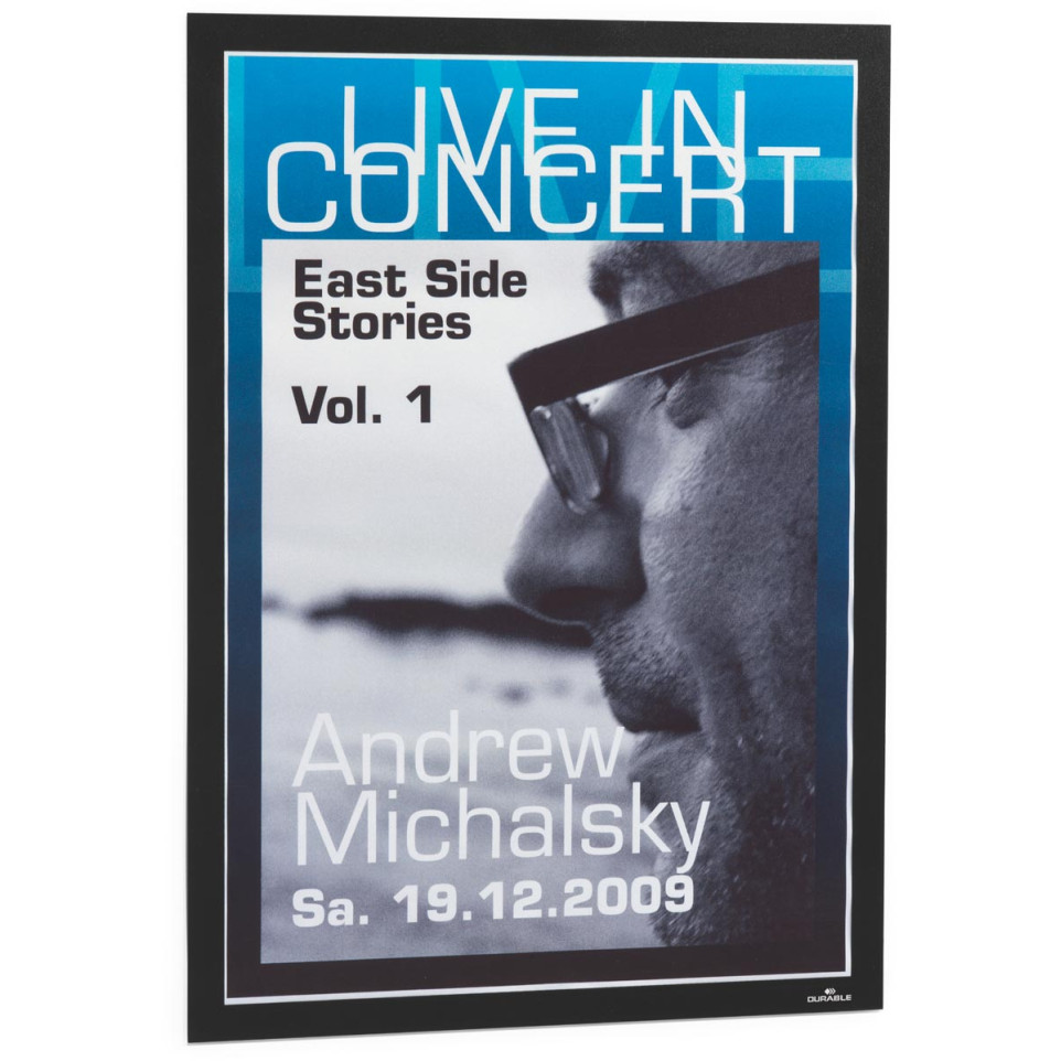 Porte-document Durable Duraframe auto-collant et cadre flexible format A3, noir, lot de 2 pièces. Idéal pour l’affichage professionnel, il permet de présenter et d’actualiser facilement vos informations sur toutes surfaces lisses (portes, murs, vitres) en environnement de bureau, magasin ou espace public.