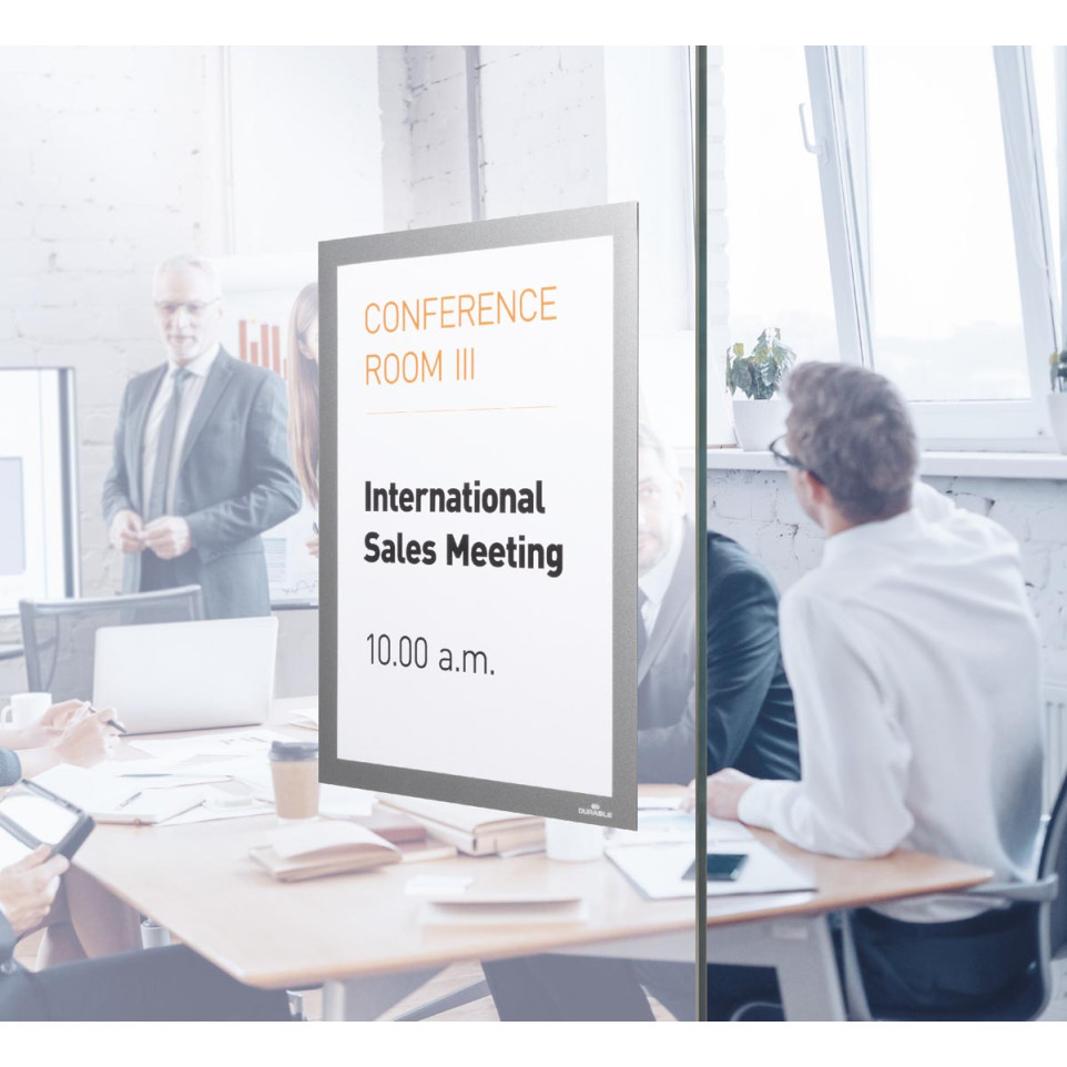 Porte-documents mural Durable Duraframe format A4, coloris argent, conçu pour afficher et protéger vos documents sur toutes surfaces planes. Parfait pour organiser fiches, consignes, horaires ou signalétiques, en pack de 10 pièces.
