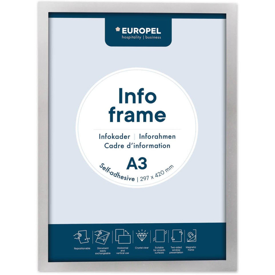 Cadre autocollant Europel au format A3, finition argentée, conçu pour l’affichage professionnel de documents sur surfaces lisses. Présentation possible en portrait ou paysage, vendu en paquet de 2 pièces.