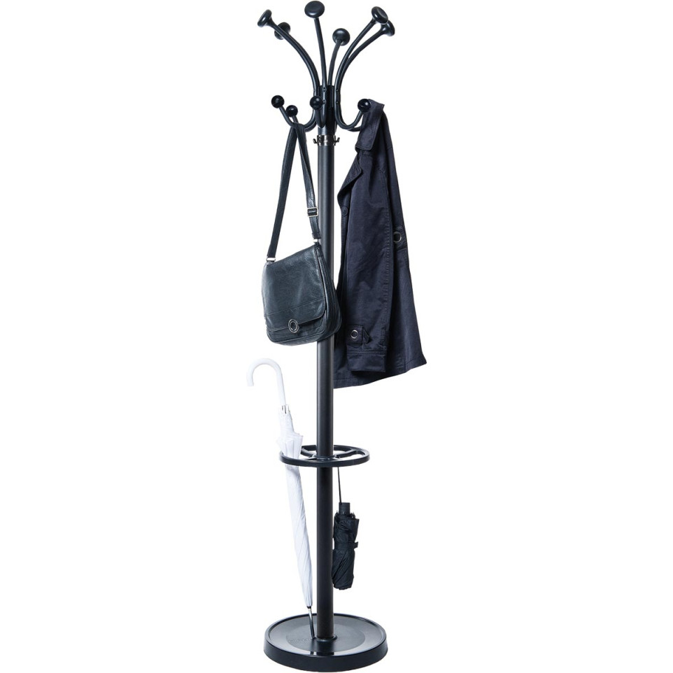 Jusqu’à 20 articles grâce à ses 12 patères en métal et 8 patères en plastique réparties sur la colonne et le porte-parapluie.