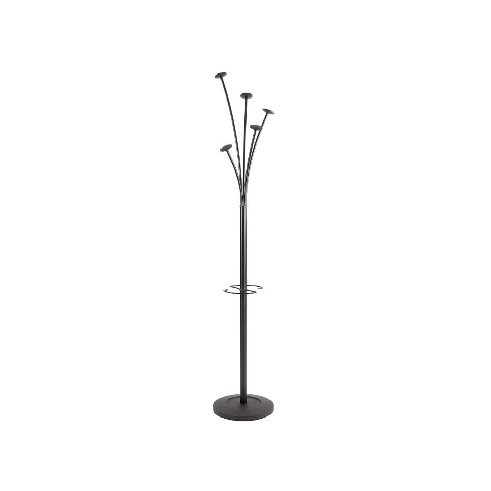 Porte-manteau vertical en acier noir équipé de 5 patères et d’un porte-parapluie intégré. Adapté aux espaces d’accueil, bureaux et halls d’entrée pour organiser manteaux et accessoires sur une structure robuste.