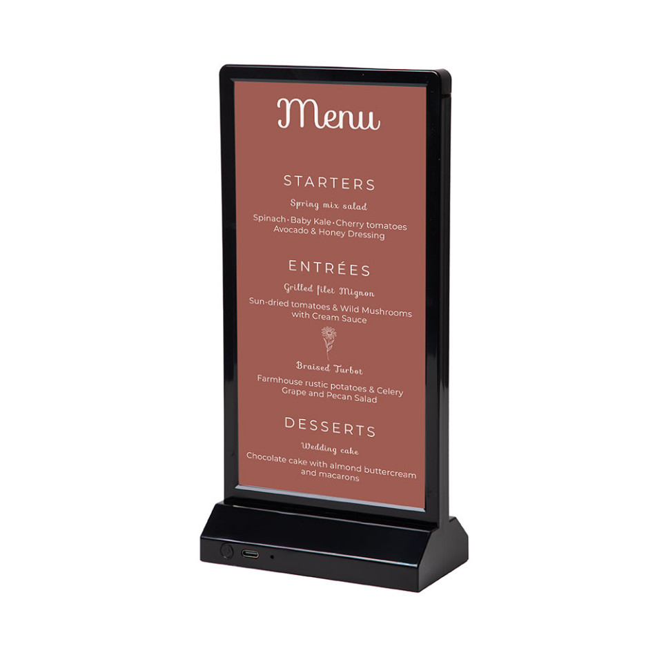 Insérez votre document au format DL dans la pochette en plastique protectrice, puis activez l'éclairage LED intégré. Le support se pose sur toute surface plane et fonctionne de manière autonome grâce à sa batterie rechargeable, sans nécessiter de branchement permanent.