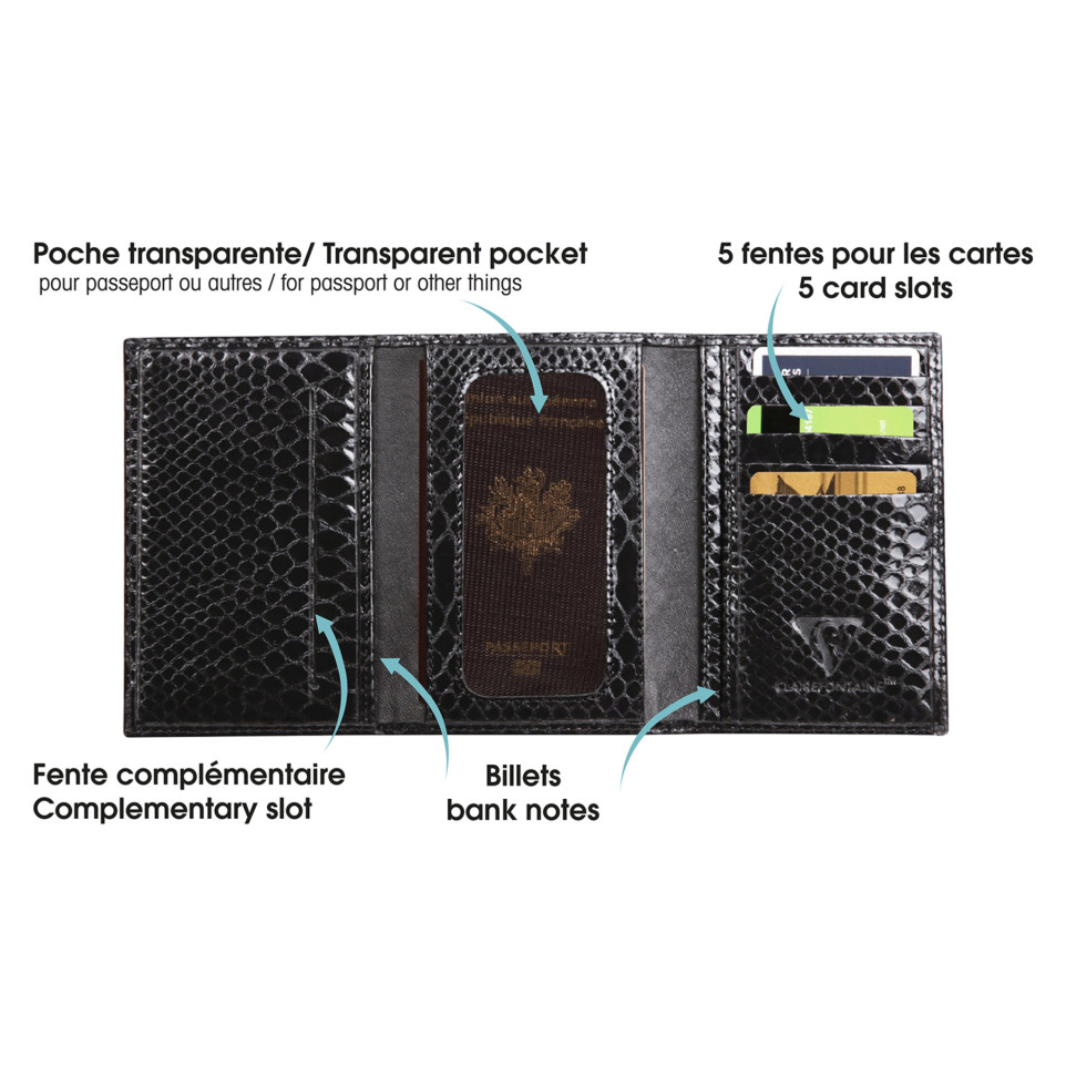 REPTILE DESIGN Porte-papiers 15x1x10 cm, Python noir En véritable cuir d'agneau, souple et agréable au toucher. Le tannage est végétal aux extraits entre autres de mimosa et quebracho et sans chrome ni arsenic afin de préserver l'environnement ainsi que les opérateurs sur place. Ce porte-papiers se compose de 3 parties repliables et comprend : * une poche transparente au centre pour y glisser permis de conduire ou passeport par exemple,* à droite, 5 fentes permettent le rangement des cartes (CB, cartes de fidélité..), * à gauche, une fente complémentaire met en évidence la carte dont vous avez besoin quotidiennement. Isolée, elle est facile à retrouver et à ranger et vous permet de gagner du temps Ce porte-papiers mixte fera un cadeau idéal à n'importe quelle occasion. Logo Clairefontaine embossé pour un aspect qualitatif et soigné. Pratique : il se glisse facilement dans votre sac à main ou votre sac de travail pour vous accompagner partout : voyage, école, travail, loisirs... Le cuir est imprimé façon python pour un rendu original et design. Notre gamme de maroquinerie propose des produits hautement qualitatifs et tendances. Nos produits en cuir sont pensés, fabriqués et testés avec la même exigence que nos produits de papeterie. Nous mettons tout notre savoir-faire au service de vos besoins.
