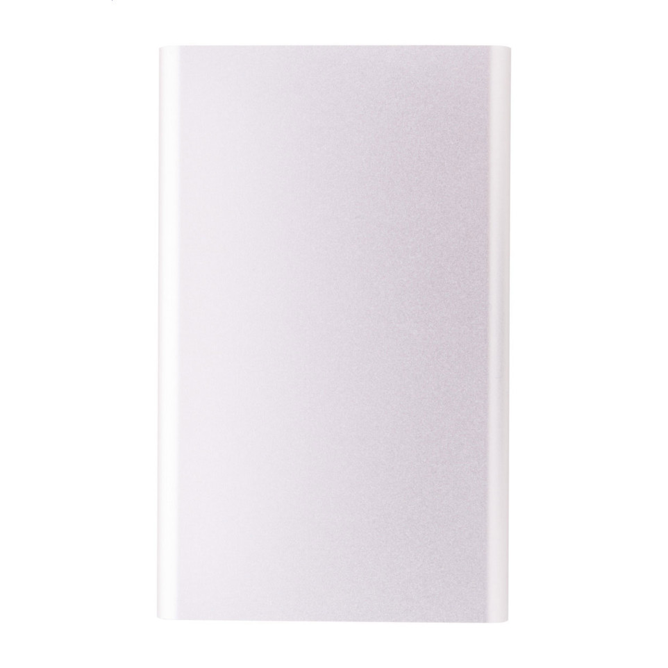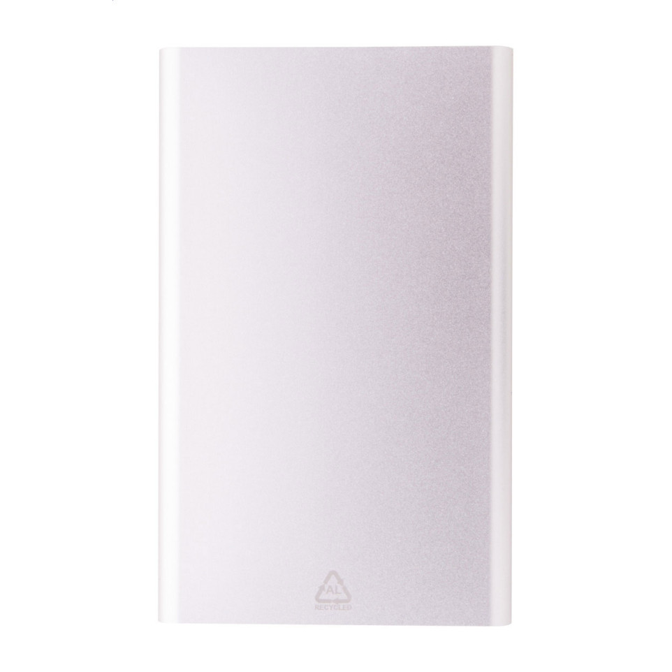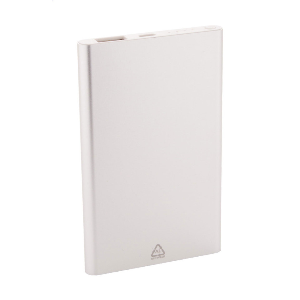 Power Bank RaluFour argenté, compact et élégant avec une batterie de 4000 mAh dans un boîtier en aluminium recyclé. Solution de recharge portable idéale pour vos appareils mobiles lors de vos déplacements.