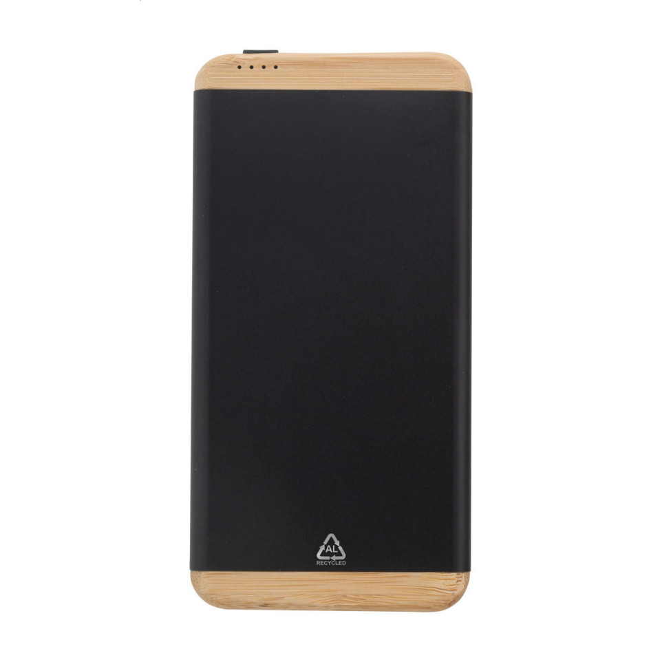 Power bank en aluminium recyclé et bambou avec batterie de 5000 mAh, doté d'un port USB et d'un port USB-C. Solution de recharge écologique et pratique pour vos appareils mobiles lors de vos déplacements.