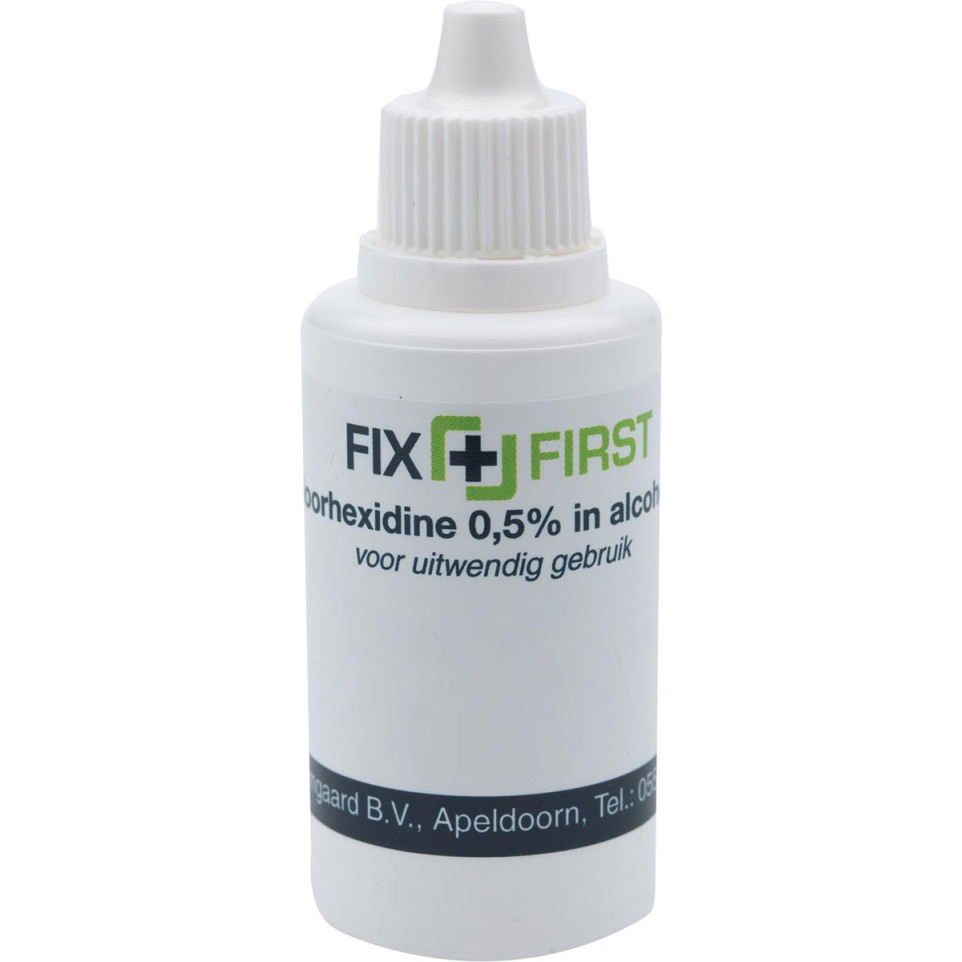 Désinfectant Fixfirst à base d'alcool en flacon de 30 ml, conçu pour le nettoyage et la désinfection rapide des plaies. Idéal pour les kits de premiers secours à usage externe, il répond aux exigences des environnements médicaux et d'urgence.
