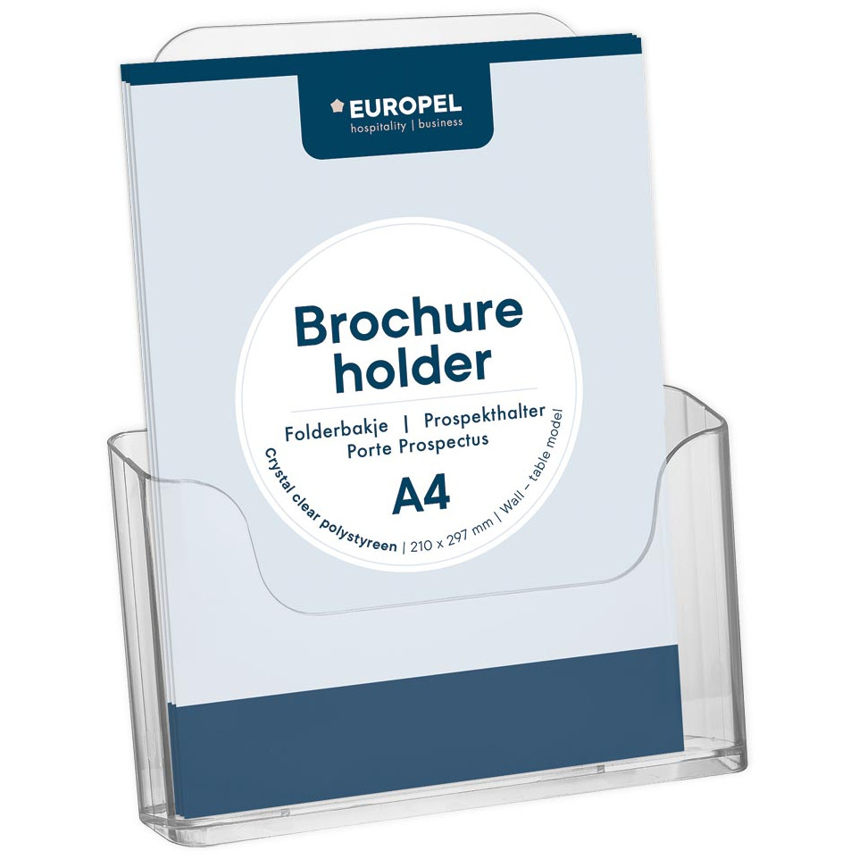 Présentoir de documents Europel conçu pour accueillir des brochures, catalogues ou étiquettes de prix au format A4. Idéal pour une présentation nette sur table ou mural, il répond aux besoins des bureaux, halls d’accueil ou points de vente.