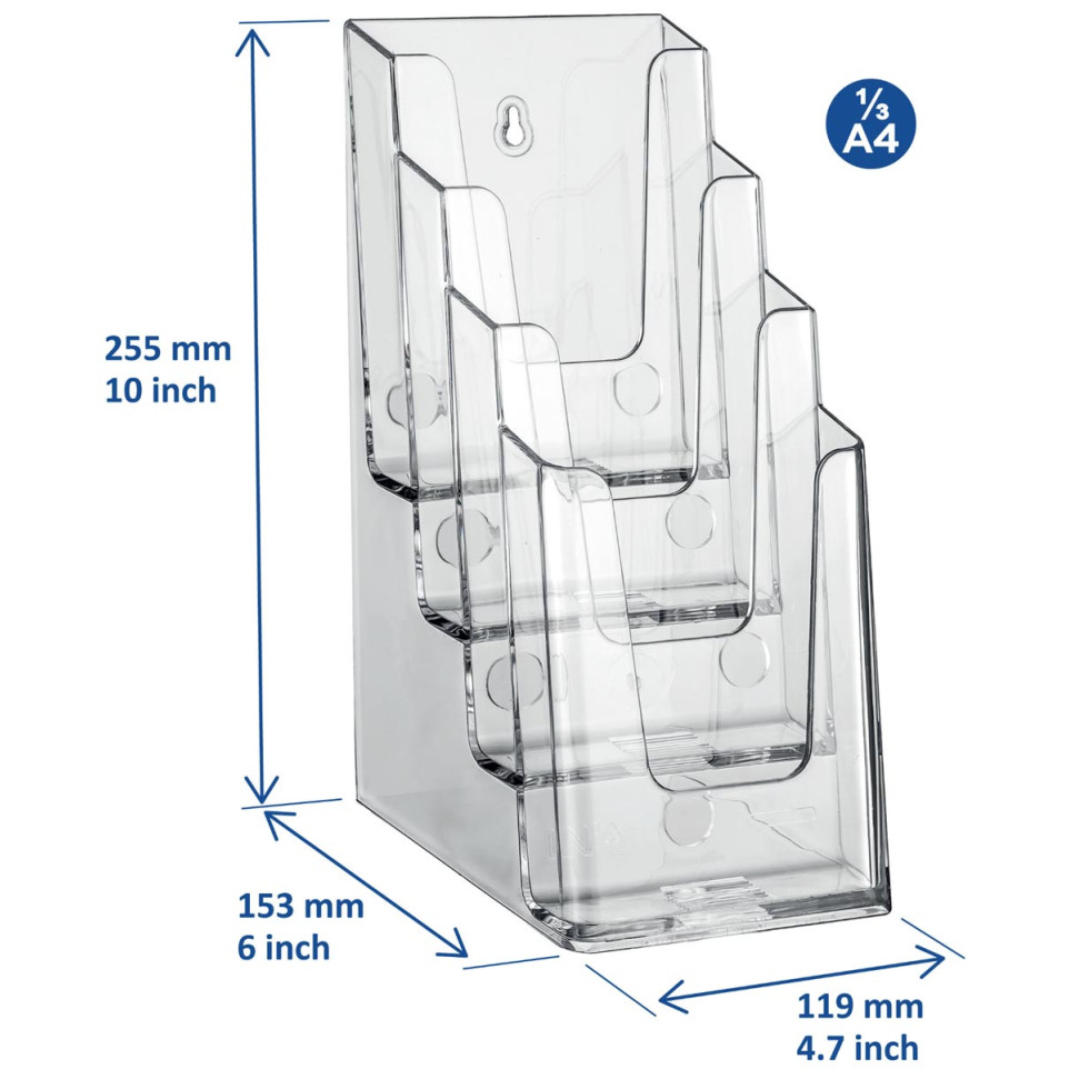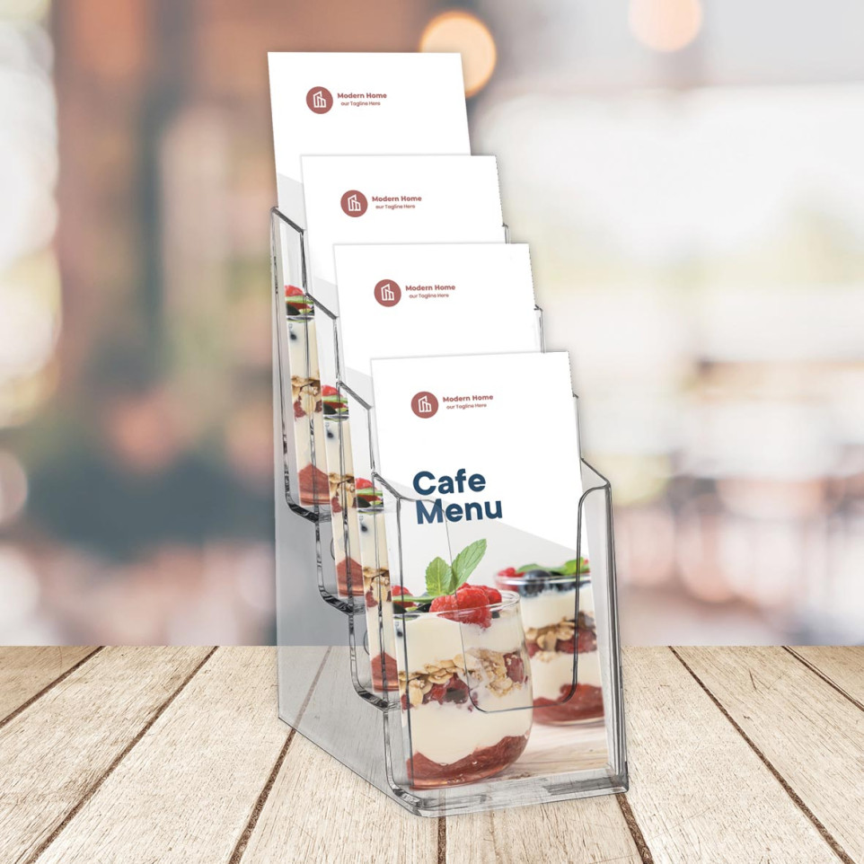 Présentoir de documents Europel conçu pour organiser et exposer jusqu’à 4 lots de documents au format 1/3 A4. Parfait pour les comptoirs, halls d’accueil ou bureaux cherchant à optimiser la visibilité de leurs supports imprimés.
