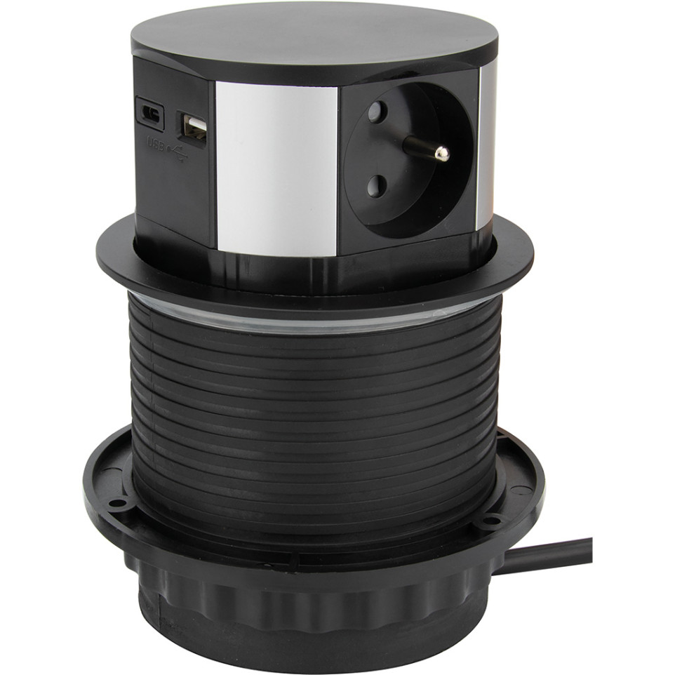 Prise à encastrer pour plan de travail Push-GIRO Ø100mm avec 3 prises 2P+T et 2 ports USB (A et C), finition noire. Idéale pour les ilots de cuisine, elle optimise la connectique tout en réduisant l’encombrement sous le plan de travail.