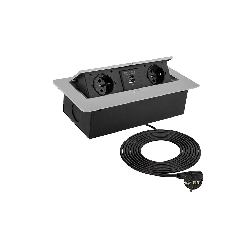 Appuyez sur le bouton discret pour ouvrir le clapet softclose et accéder aux prises et ports USB, puis branchez vos appareils. Installation possible sur table, plan de travail, bureau ou mur, pour un usage quotidien en toute sécurité grâce à sa conception robuste et encastrable.