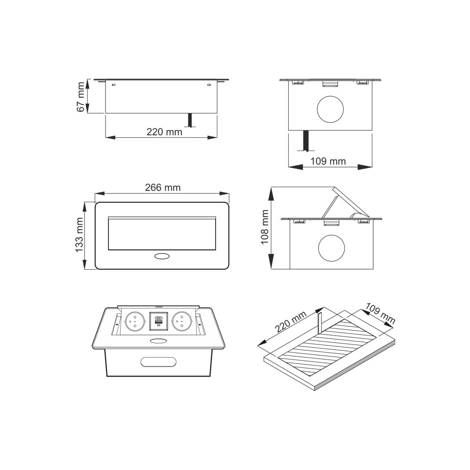 - Façade : 266 x 113 mm, compartiment encastré : 223 x 109 mm, profondeur : 65 mm, panneau frontal : 2 mm