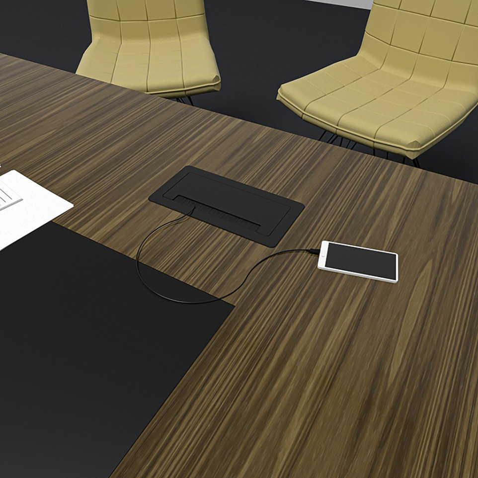 Le module s’installe directement dans le plan de travail et permet, grâce à son clapet, de dissimuler les connecteurs lorsque non utilisés. Il fournit l’accès immédiat à l’alimentation électrique, à la recharge USB, à la connectivité réseau (RJ45) et à la transmission vidéo (HDMI), simplifiant l’organisation du poste de travail.