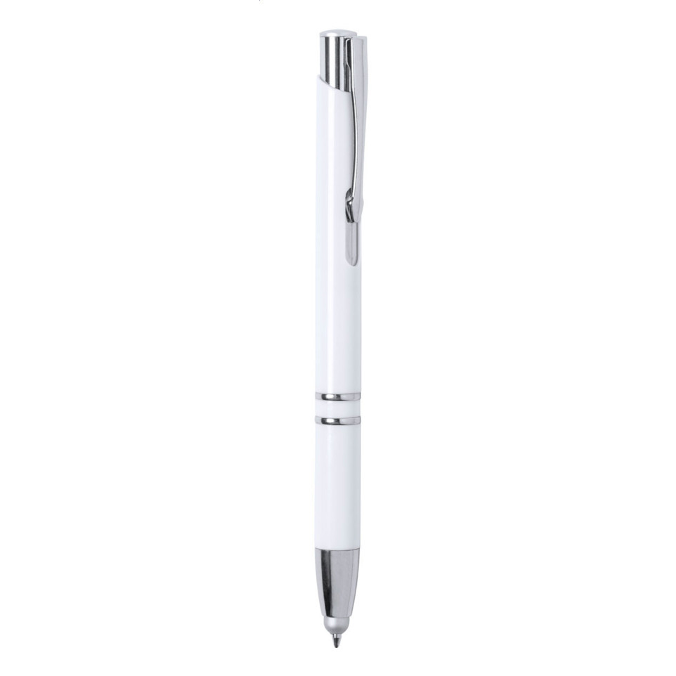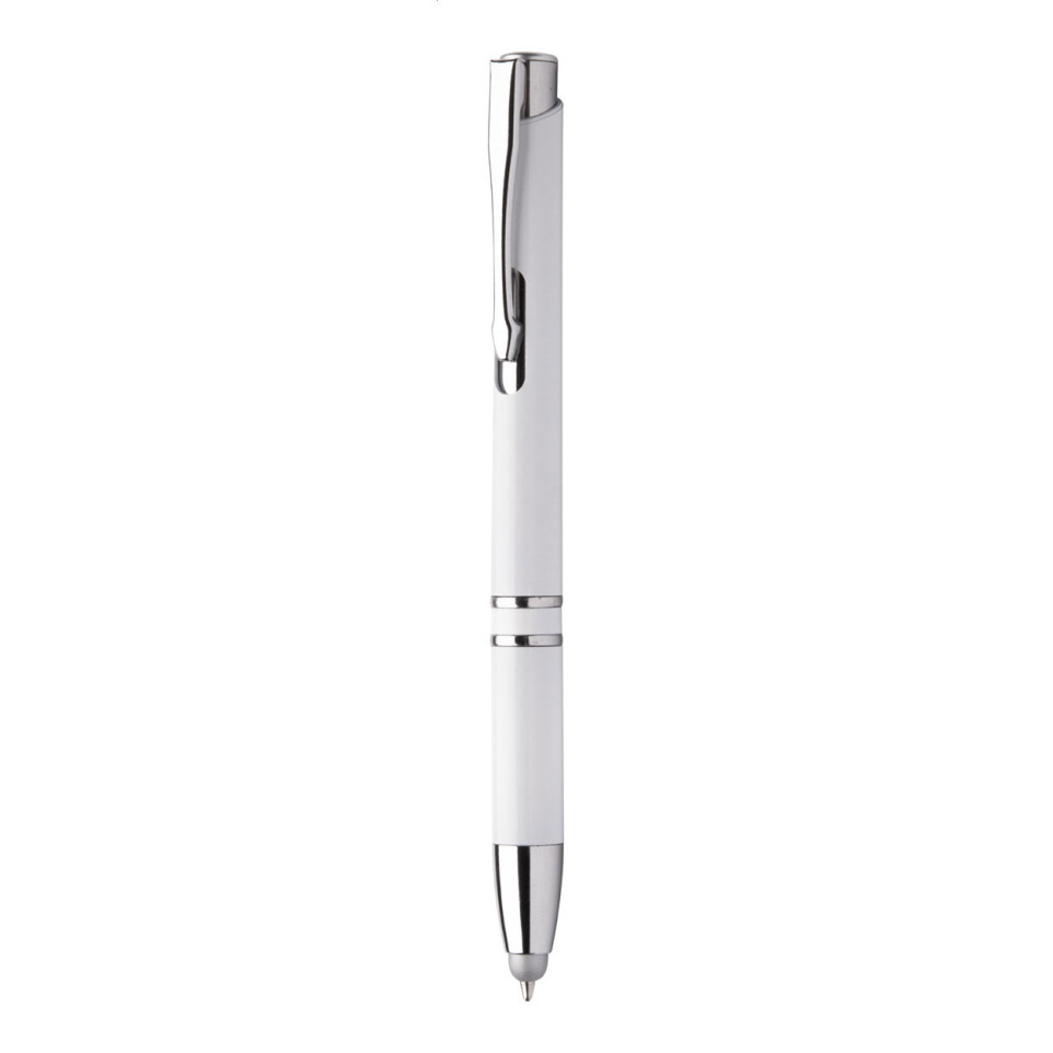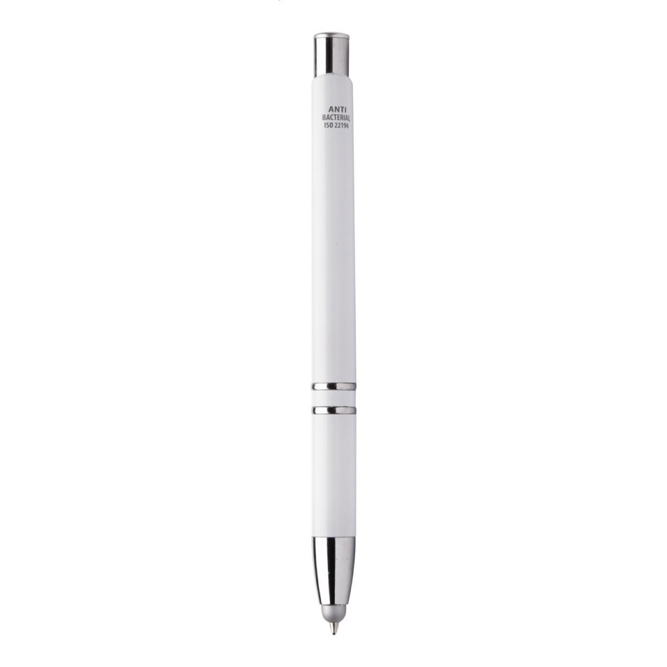 Stylo bille multifonction antibactérien Clonnel blanc avec fonction stylet pour écrans tactiles. Outil d'écriture pratique et hygiénique, idéal pour les environnements professionnels ou médicaux nécessitant une attention particulière à l'hygiène.