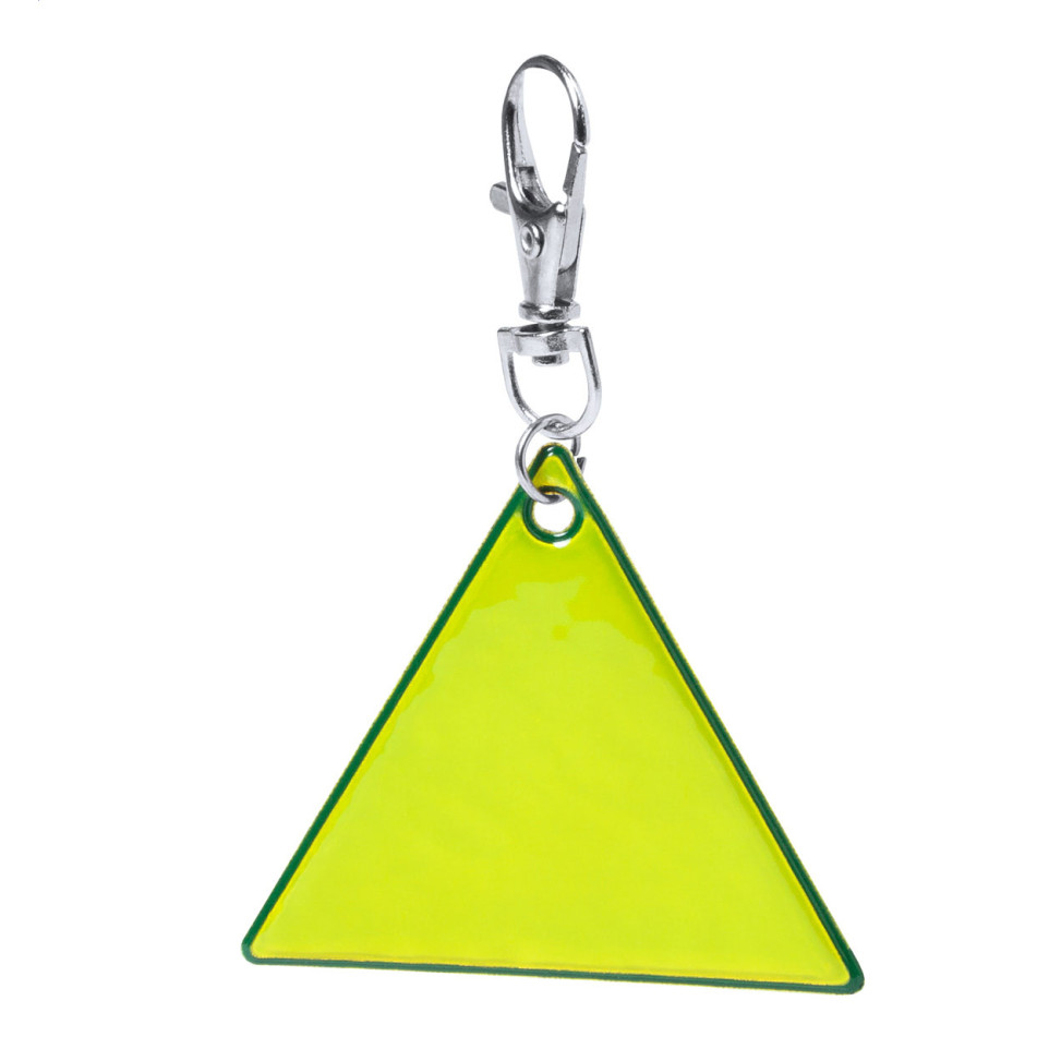 Porte-clés réfléchissant Trikke jaune en PVC, de forme triangulaire avec mousqueton intégré. Idéal pour augmenter la visibilité lors de déplacements, il s’utilise en complément sur sacs, clés ou vêtements, notamment en conditions de faible luminosité. Usage strictement promotionnel.