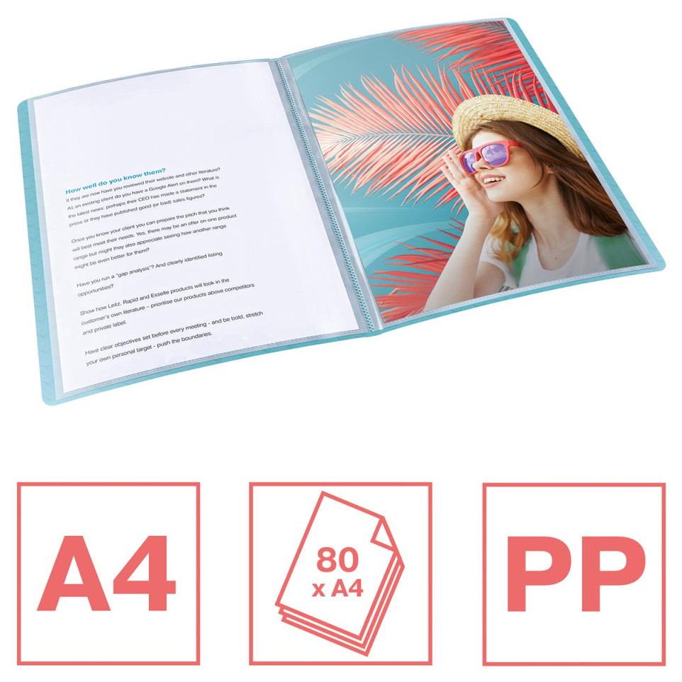Protège-documents Esselte Colour'Breeze bleu, idéal pour classer et protéger jusqu'à 80 feuilles format A4 grâce à ses 40 pochettes fixes transparentes. Parfait pour l’organisation de documents professionnels ou scolaires.