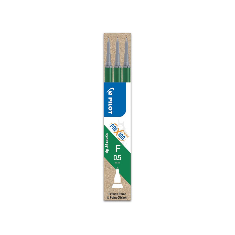 Boîte de 3 recharges vertes pour rollers Pilot Frixion Point, idéales pour le stylo à pointe fine High-Tecpoint 0,5 mm. Largeur de trait 0,25 mm pour une écriture ultra-précise et nette au quotidien.