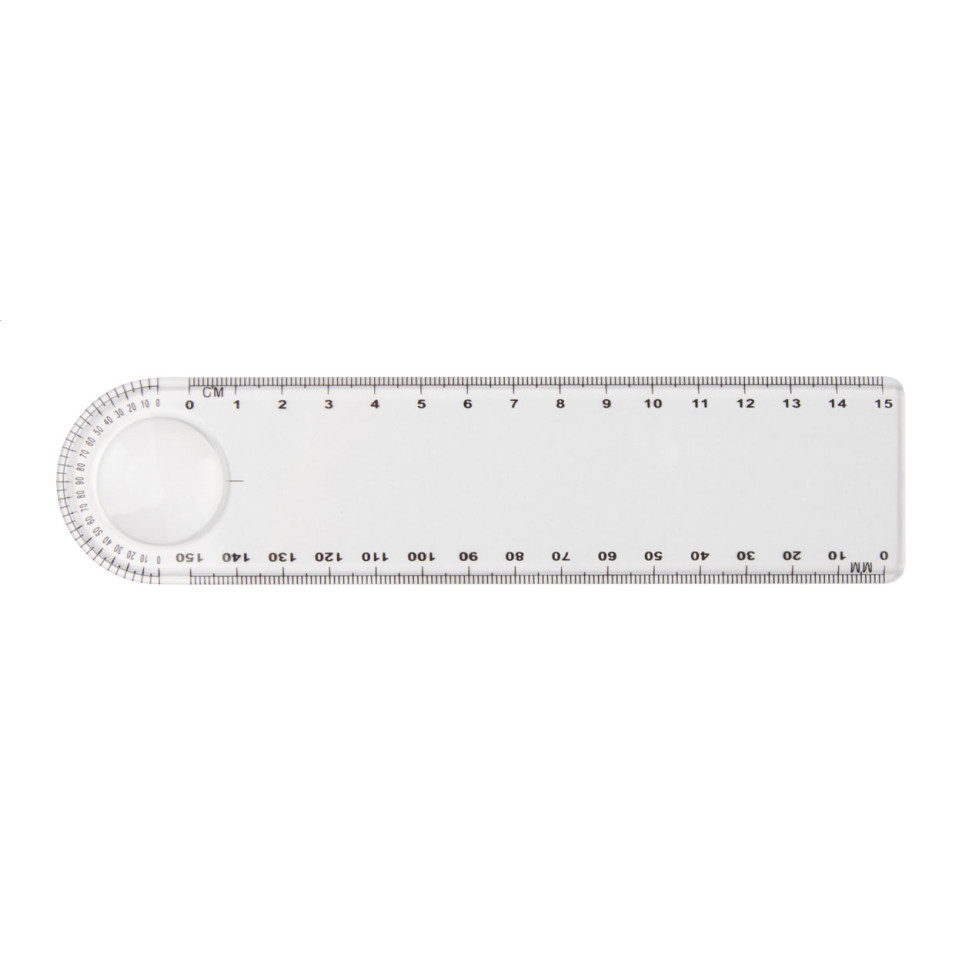 Règle linéaire de 15 cm en plastique transparent, dotée d’une loupe intégrée pour faciliter la lecture précise des mesures ou petits textes, idéale pour bureaux, écoles, travaux de précision ou usages quotidiens.